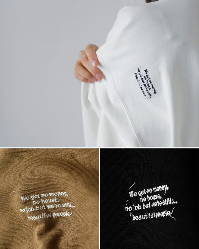 右胸にはブランドロゴ、左肩にはシーズナルな「always beautiful」ロゴをそれぞれ裏打ち刺しゅうで配置。主張しすぎないディテールとして、デザインに奥行きを与えています。