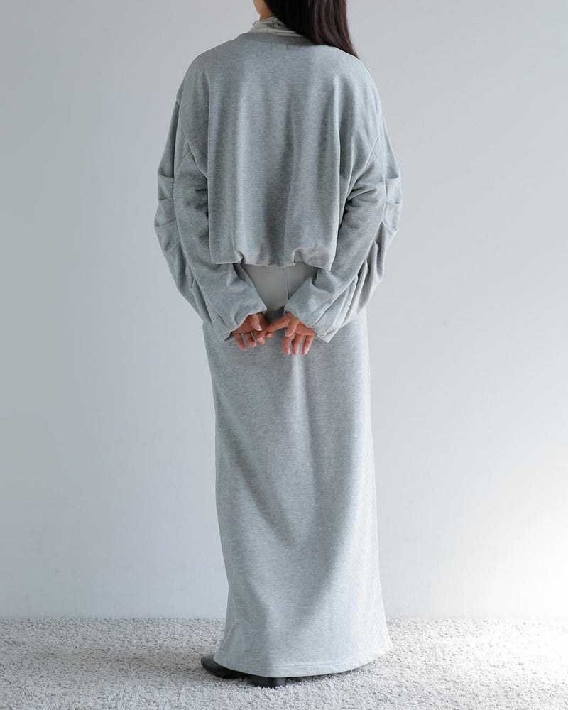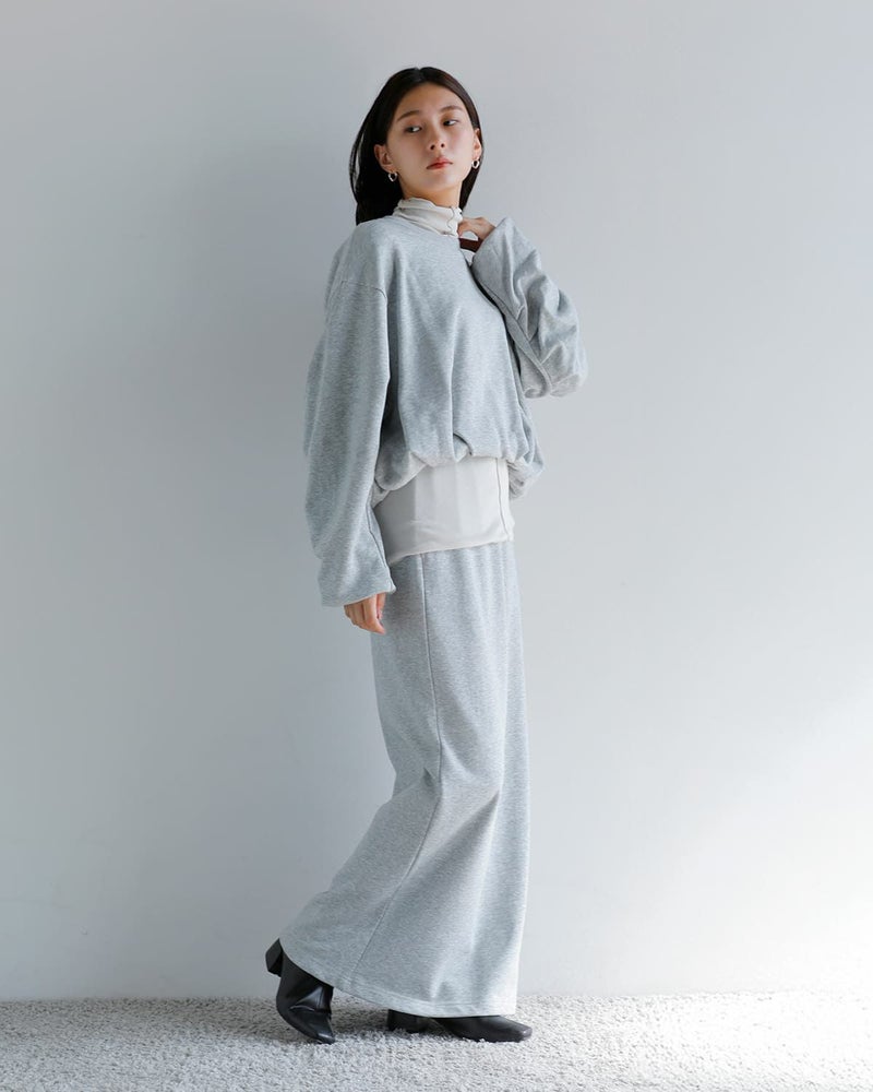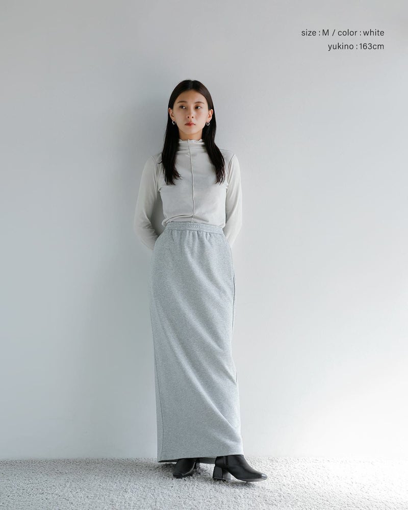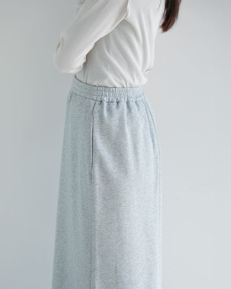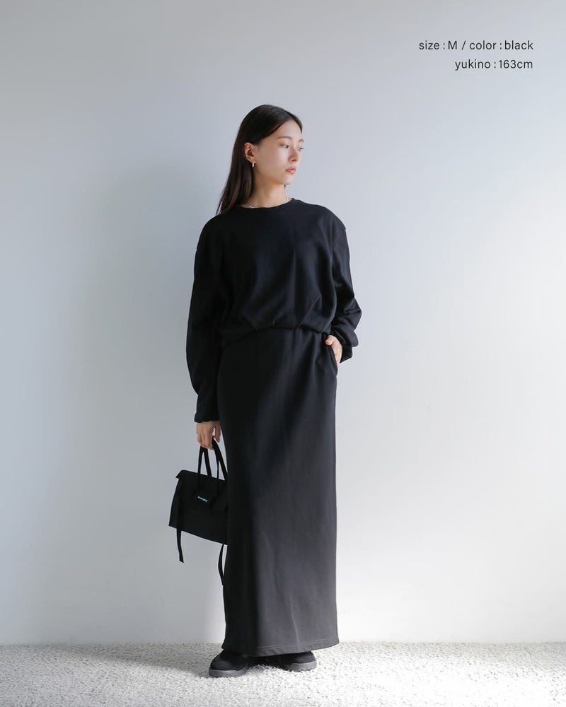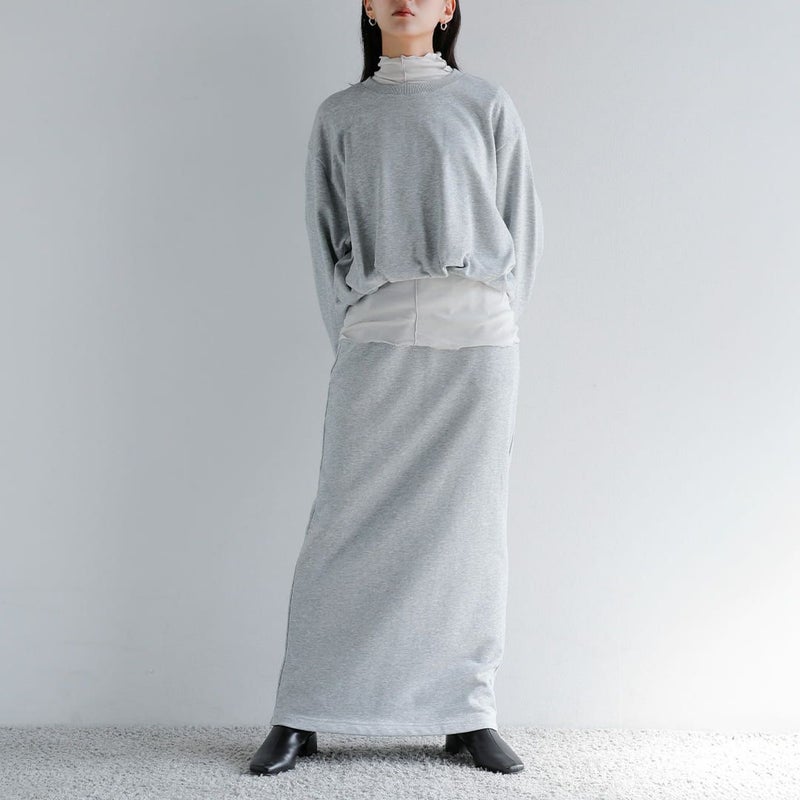 スカートはストレートシルエットで、セットアップで着用した際のバランスを考慮したデザイン。スウェット素材ながらもタイトなラインにすることで、カジュアルになりすぎず上品な印象を演出します。ほど良い厚みの生地を使用しており、真夏以外のロングシーズン着用可能。1枚で存在感がありながら、トップスとスカートそれぞれ単品でも活躍する汎用性の高いアイテムです。