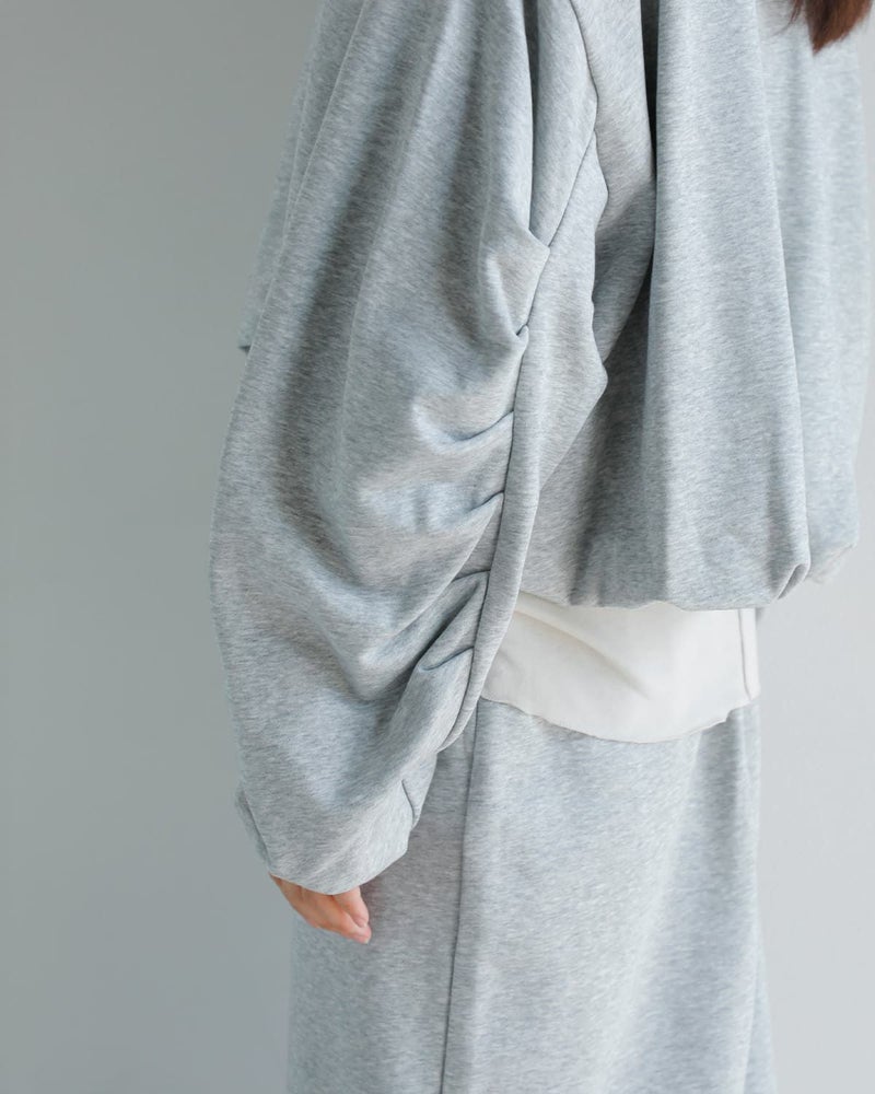 トップスはバルーンディテールによる丸みのあるフォルムで、程よいボリュームを持たせたショート丈。スカートはストレートシルエットで全体のバランスを引き締め、セットアップとして着た際にもすっきりとした印象を与えます。