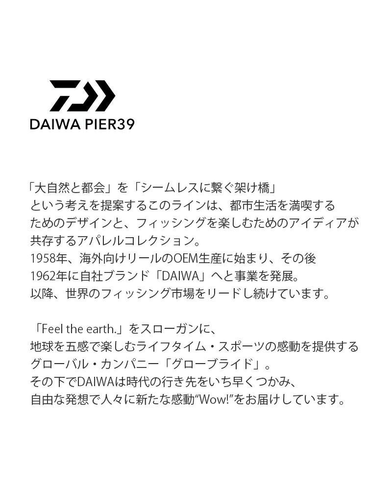 「大自然と都会」を「シームレスに繋ぐ架け橋」という考えを提案するこのラインは、都市生活を満喫するためのデザインと、フィッシングを楽しむためのアイディアが共存するアパレルコレクション。1958年、海外向けリールのOEM生産に始まり、その後1962年に自社ブランド「DAIWA」へと事業を発展。以降、世界のフィッシング市場をリードし続けています。「Feel the earth.」をスローガンに、地球を五感で楽しむライフタイム・スポーツの感動を提供するグローバル・カンパニー「グローブライド」。その下でDAIWAは時代の行き先をいち早くつかみ、自由な発想で人々に新たな感動“Wow!”をお届けしています。