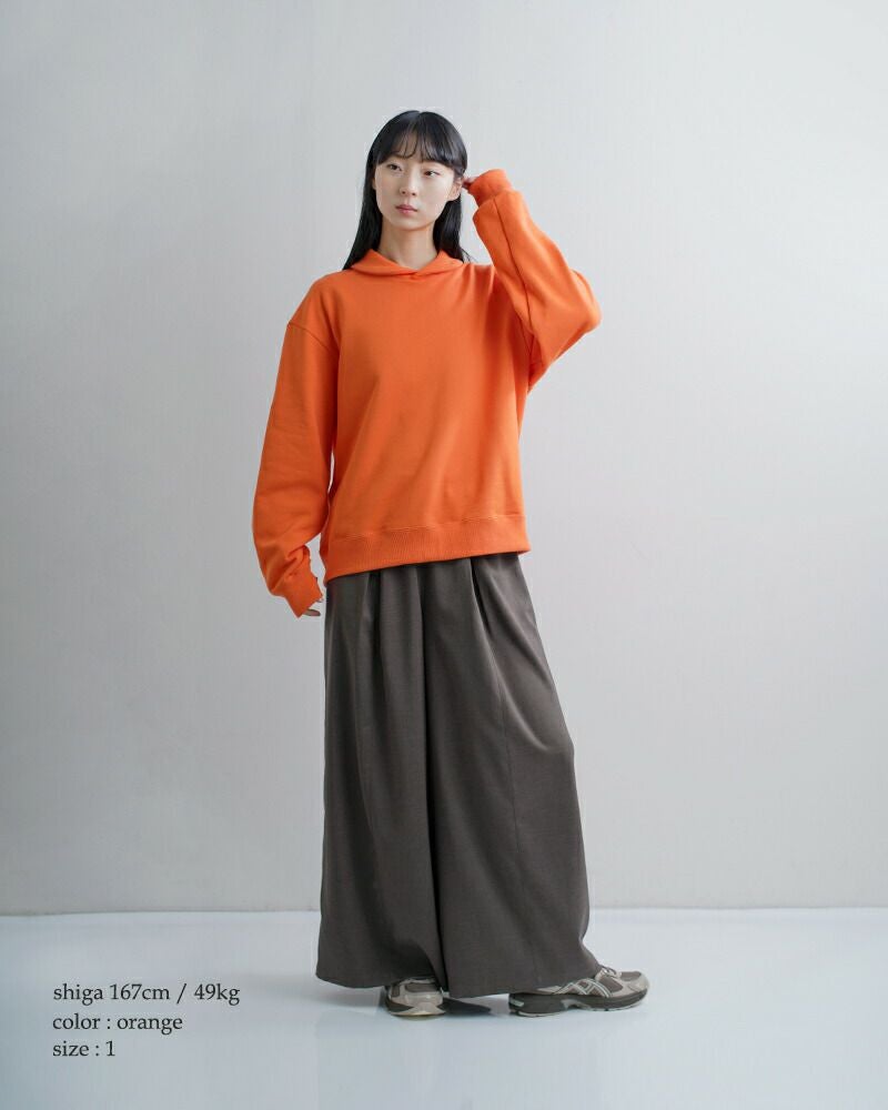 裏毛仕様で、ふんわりとした着心地を生み出します。カジュアルな印象を持ちながらも、生地表面はすっきりと整った質感。ラフになりすぎず、大人のデイリースタイルにも自然に馴染みます。