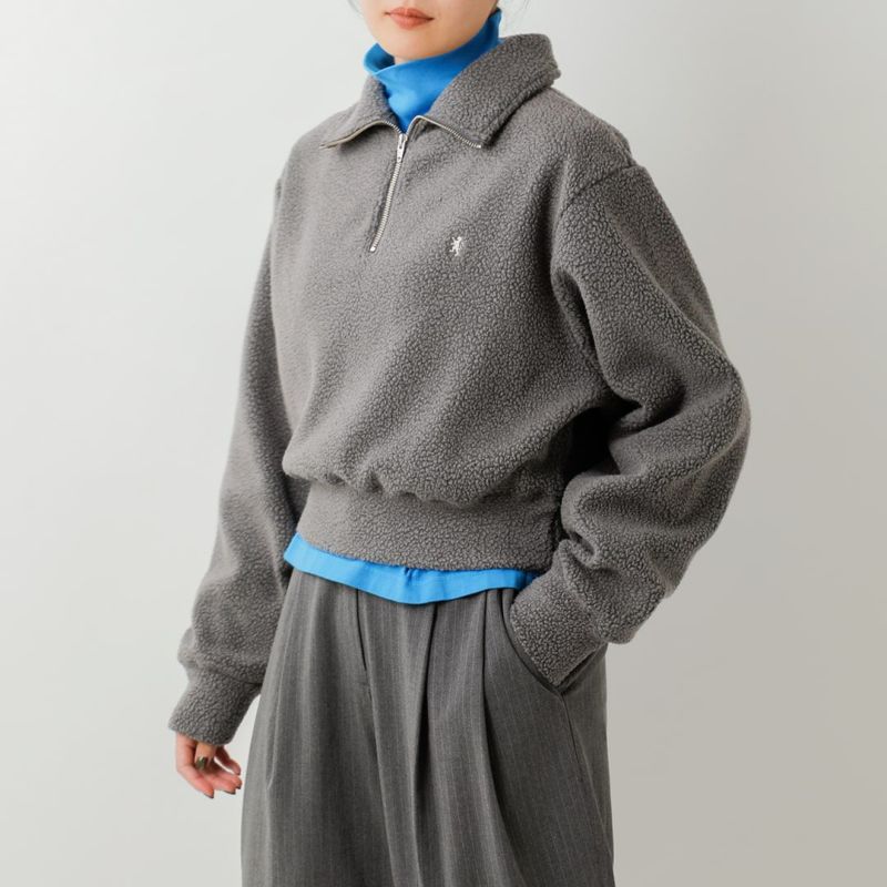 Gymphlex(ジムフレックス)より、フリース ハーフジップ プルオーバーのご紹介です。大きめの衿のハーフジッププルオーバーです。ざっくりと大きめのシルエットではありますが、着丈を短めに設定することでスポーティーなデザインに仕上げています。