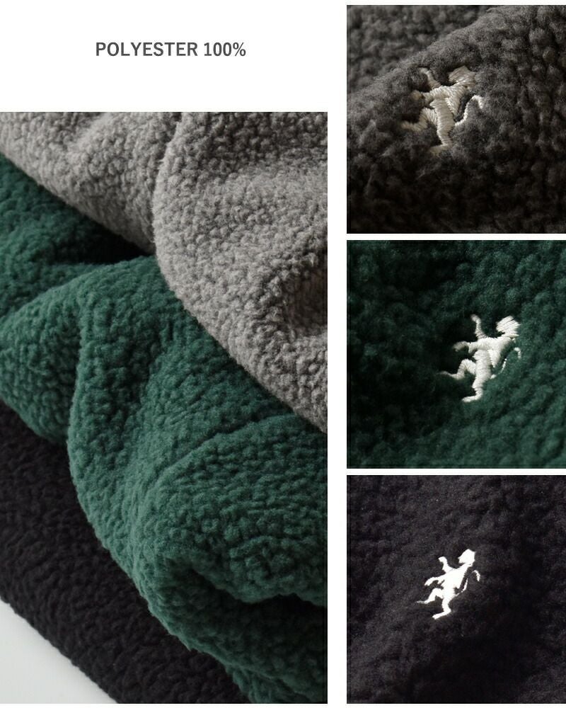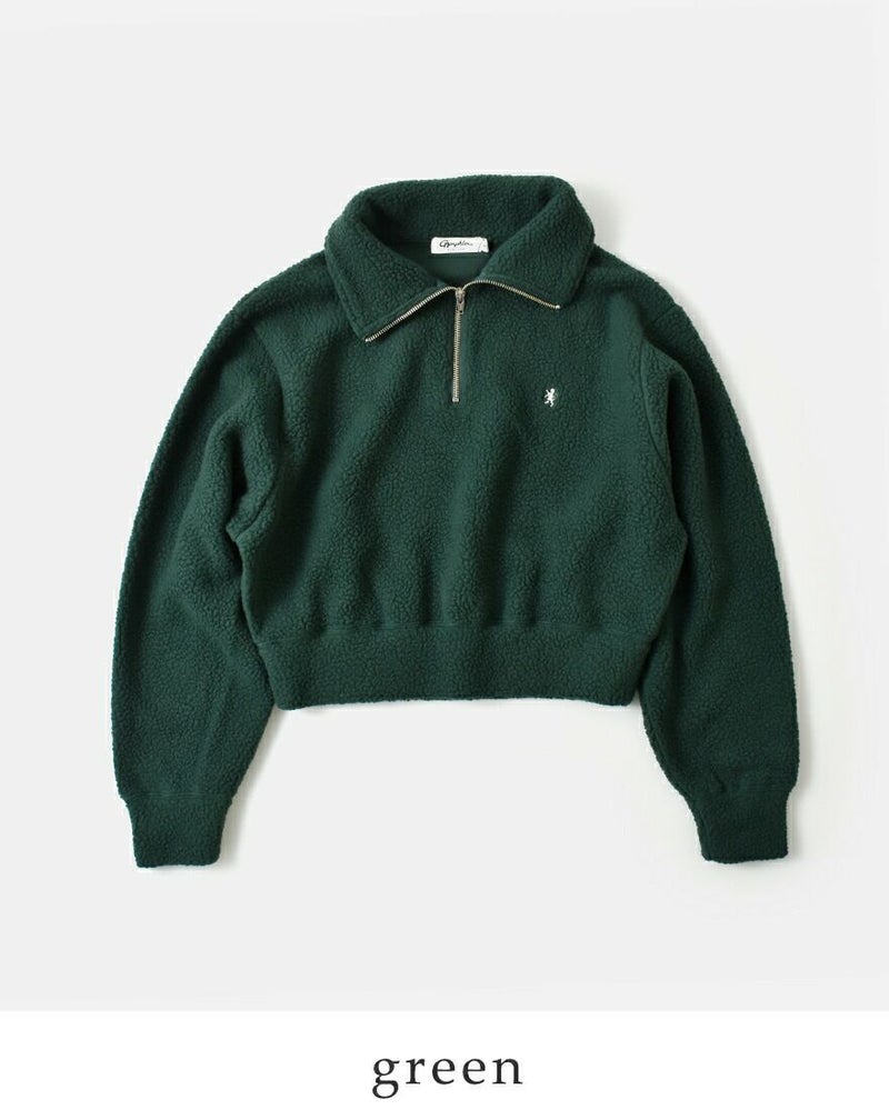 ハリ感を持たせながらも柔らかさと膨らみをキープし、着心地の良さにこだわったフリース素材です。見た目にも暖かみがあり、保温性もあります。左胸のグリフィン刺繍もポイントになっています。