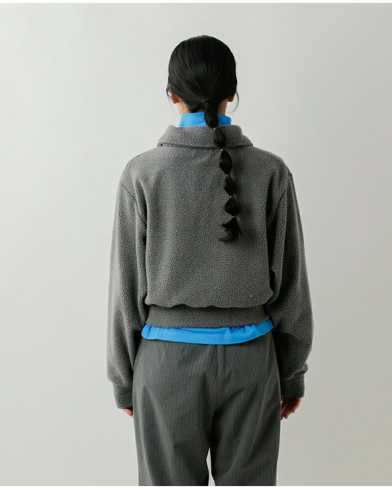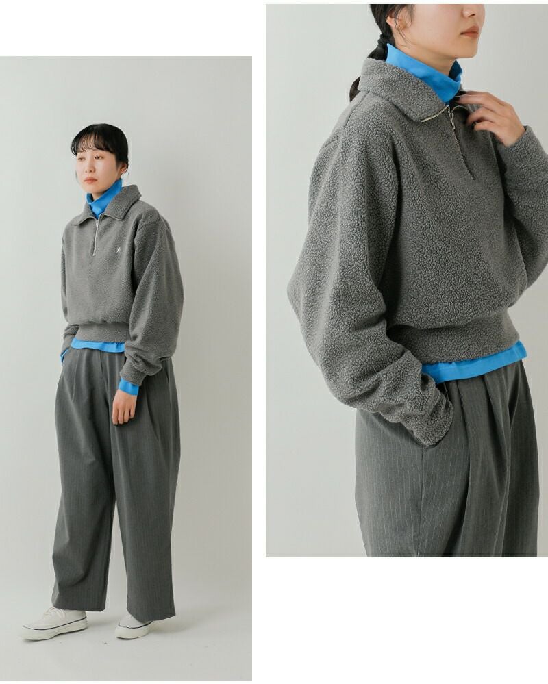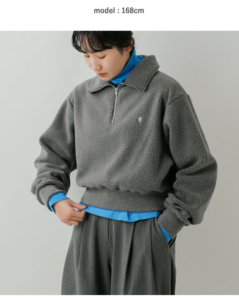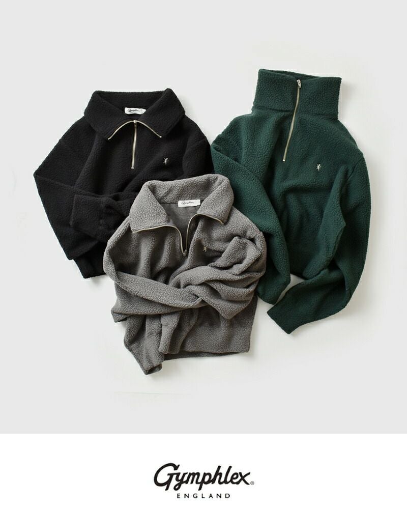 Gymphlex(ジムフレックス)より、フリース ハーフジップ プルオーバーのご紹介です。大きめの衿のハーフジッププルオーバーです。ざっくりと大きめのシルエットではありますが、着丈を短めに設定することでスポーティーなデザインに仕上げています。