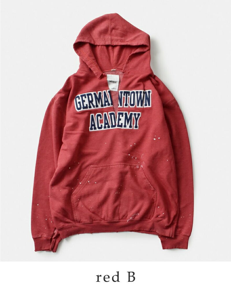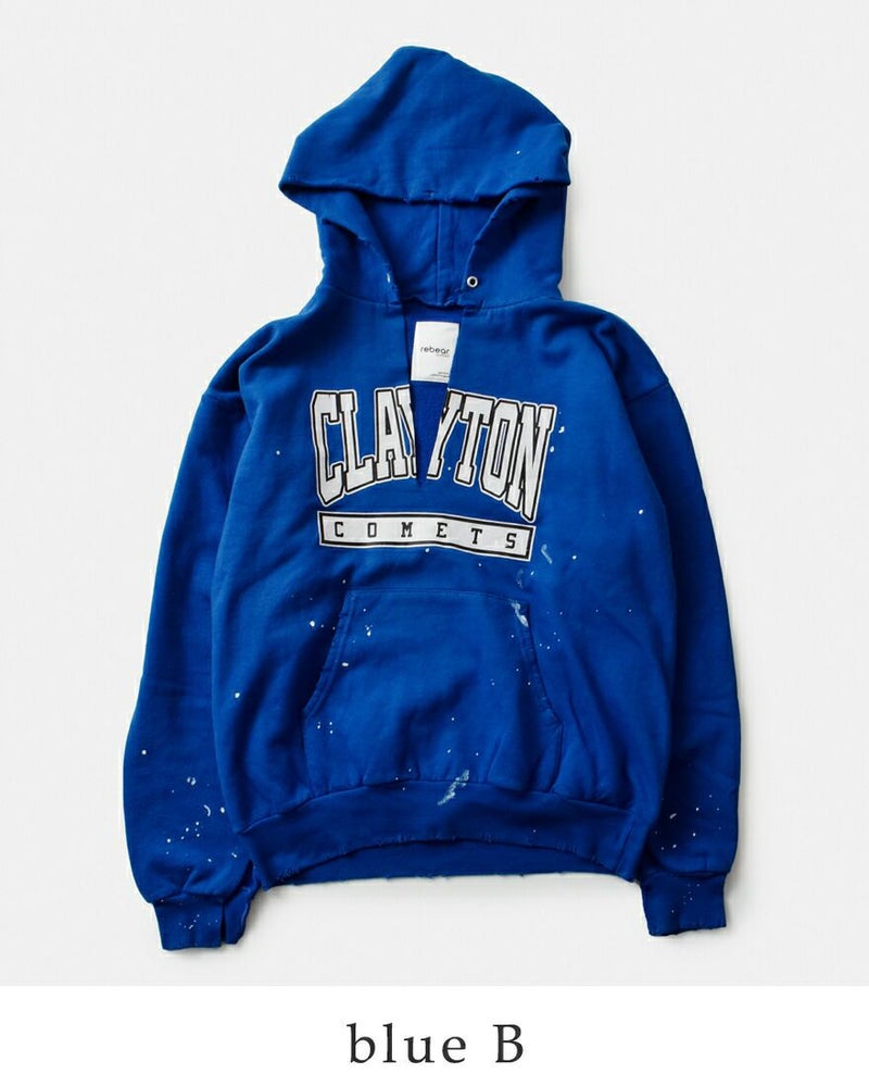 パーカー全体にダメージ加工とペイントを施した、オリジナルのデザイン。1点1点ディティールの表情が異なり、他にはないオンリーワンアイテムに愛着が湧きます。