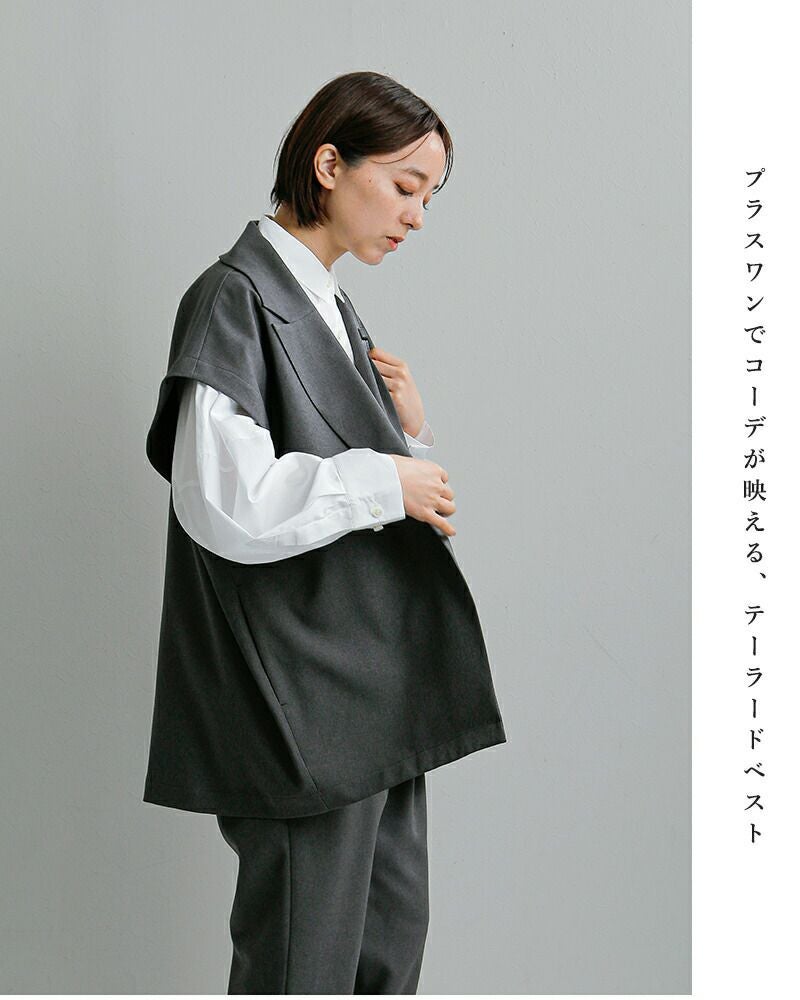 テーラードカラーが印象的なベストは、羽織るだけでスタイリングを引き締める存在感。ゆったりとしたシルエットで、インナーを選ばず幅広いコーディネートに対応します。