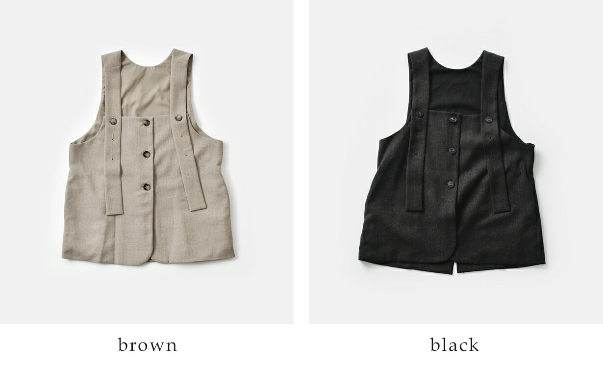前後でシルエットが変わる2WAY仕様のキャミ風ベストが登場。2025SSに登場した人気アイテムをベースに、より幅広いボトムとのバランスを意識して丈を短めにアップデートしました。釦の位置や衿の開きなど、細かな調整も加えて完成度をさらに高めています。前後を逆に着用することで、ウエストの切り込みがアクセントになり、女性らしい印象をプラス。肩のストラップは3段階で着丈調整ができ、ウエスト切込み下にのスリット部分にはボタンが付いており、着こなしのアレンジも自在な1枚です。