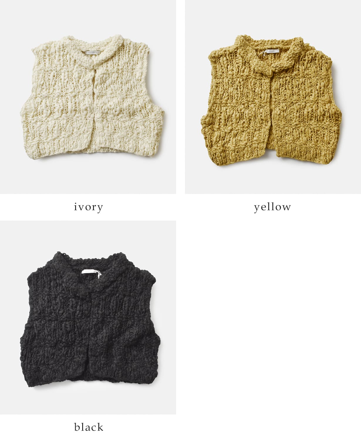 ぽこぽことした立体的な編地が可愛らしいニットベスト。ショート丈でトレンド感があり、着るだけで今どき感のお洒落を楽しめます。手持ちのカットソーやニット、ブラウスなどに合わせるだけで、いつものコーディネートが華やかに。ウール混ニットで暖かく、重ね着で防寒対策も出来ます。