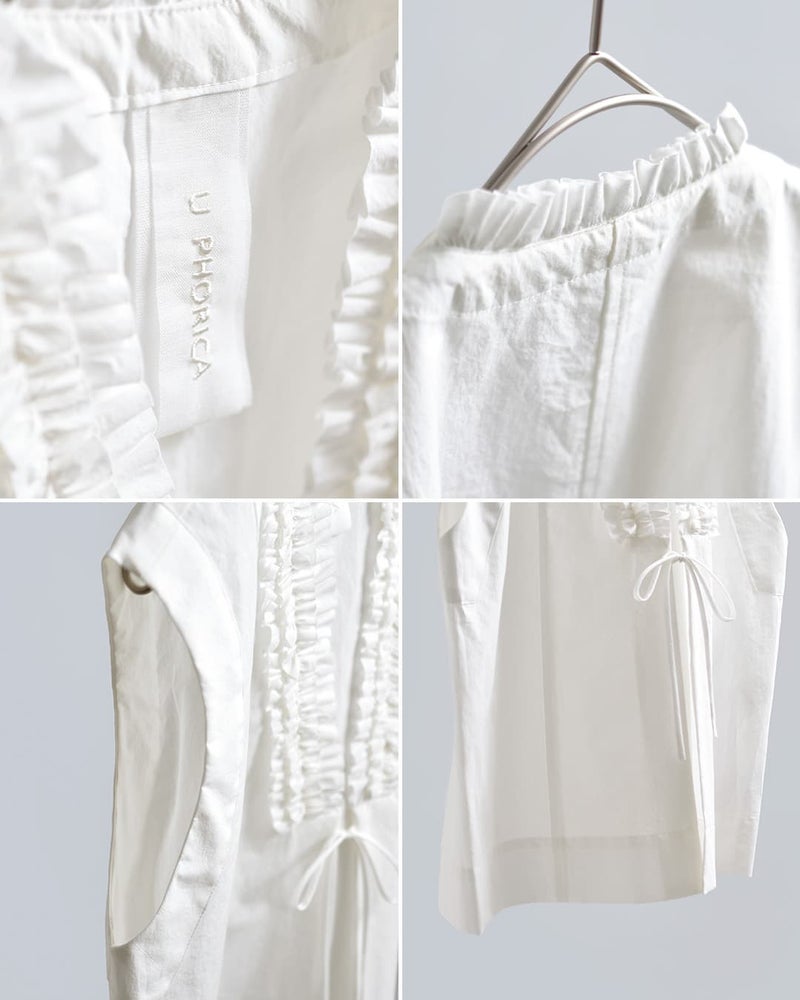 U PHORICA(ユーフォリカ)より、近江晒コットン Vネックフリルジレのご紹介です。染色前に生地を繰り返し揉み込むことで、洗いざらしのような自然なシワ感と、ふんわりとした膨らみを持たせた近江晒のコットンタイプライターを使用。高密度ながらもやわらかな質感で、軽やかで心地よい着用感に仕上げられています。襟元にはバイアス裁ち切りのギャザーをあしらい、表情豊かなアクセントに。すっきりとしたVネックとゆとりのあるアームホールで、真夏でも快適にレイヤードが楽しめる一枚です。シックなカラーリングにより、フリルの甘さを抑えた大人らしい印象に仕上がっています。