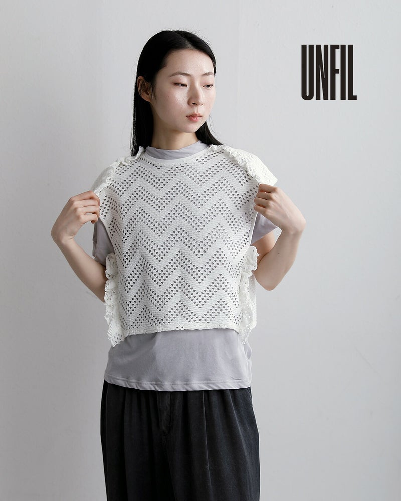 unfil(アンフィル)より、パターンメッシュコットンフリルノースリーブプルーバーのご紹介です。フリルのついた四角いレースのハンカチを折り返したようなデザインのTOPSです。丸編みのメッシュは、通常専用の機械を使用して作成するところ、専用機ではなく、独自の編み組織を作成しさらにメッシュの穴を専用機ではできない大きさで編んだ生地になります。ノースリーブのデザインが涼しげな抜け感をプラスし、暑い季節でも快適にレイヤードスタイルを楽しむことが出来ます。