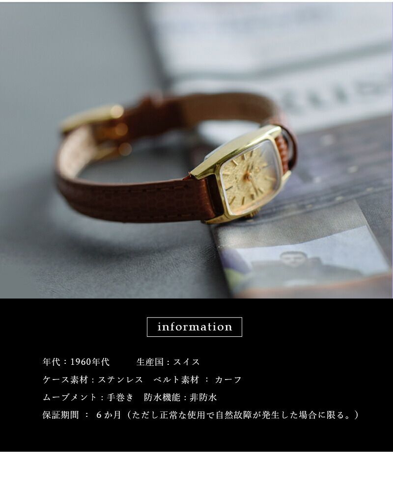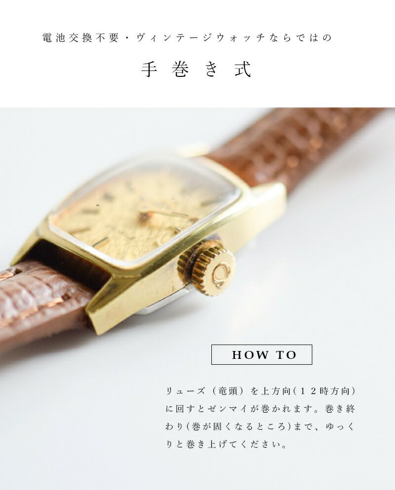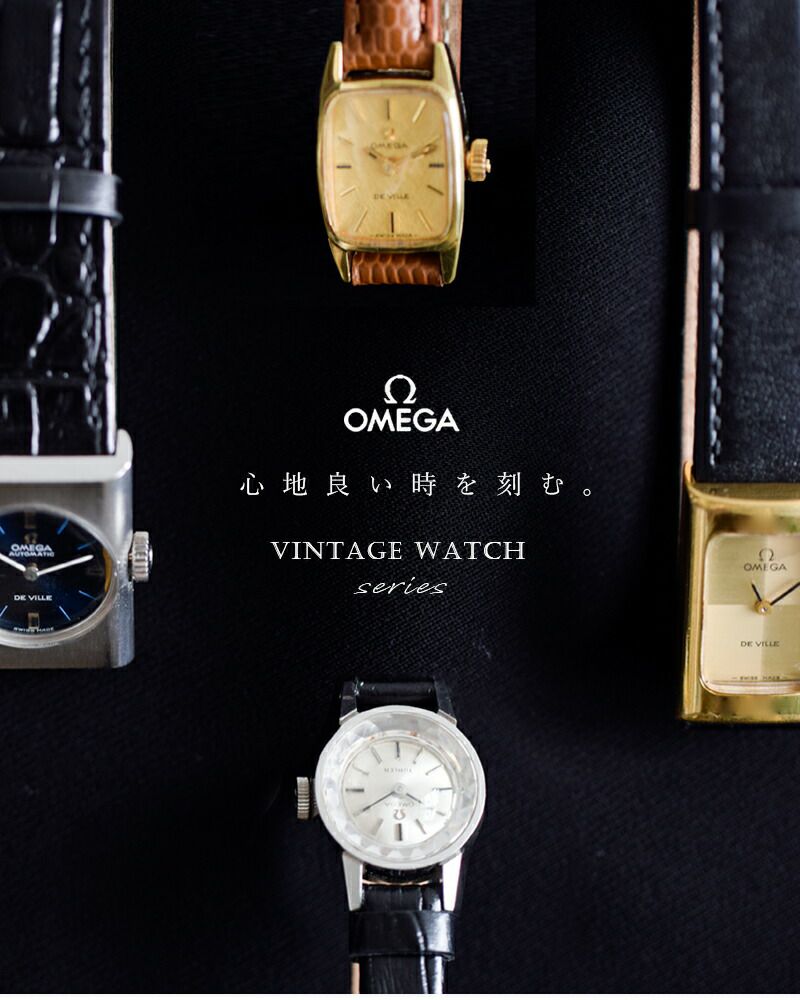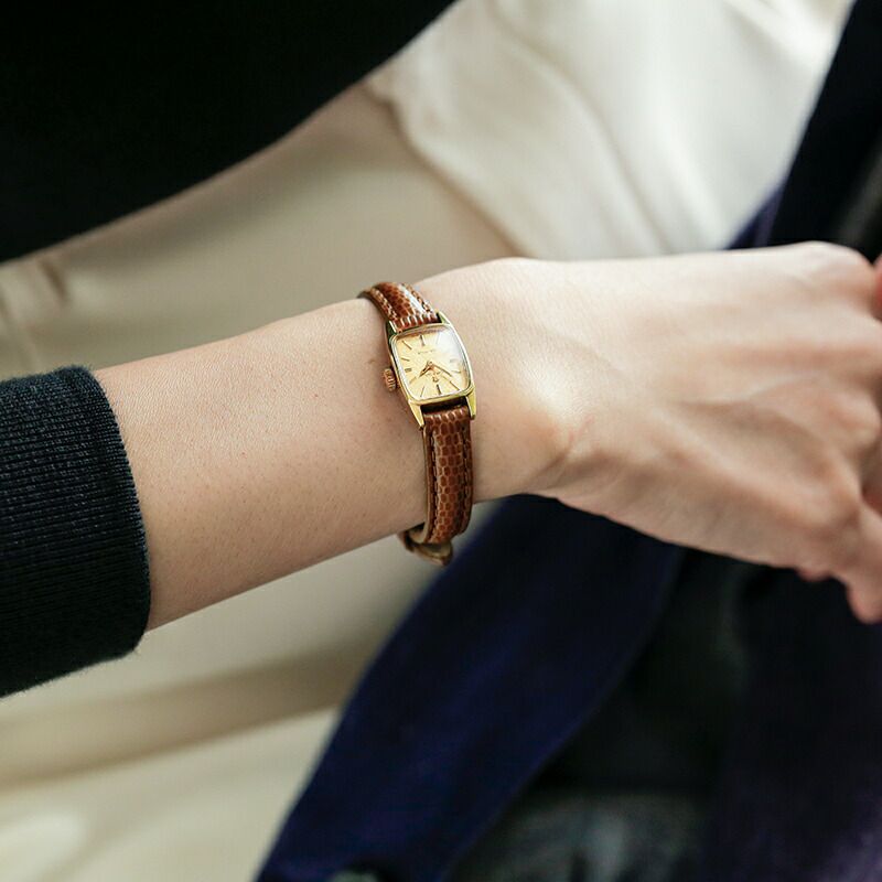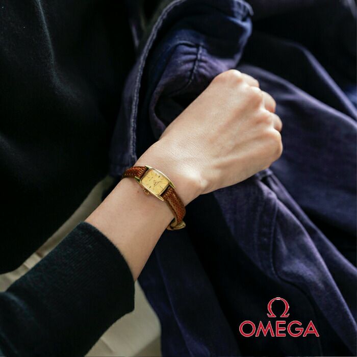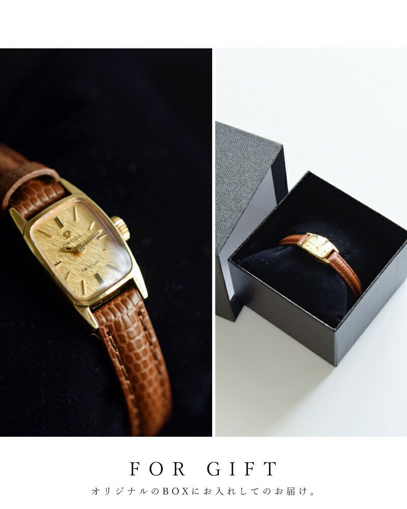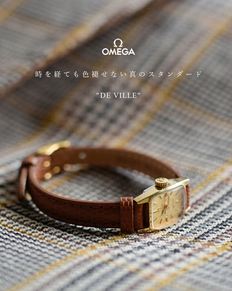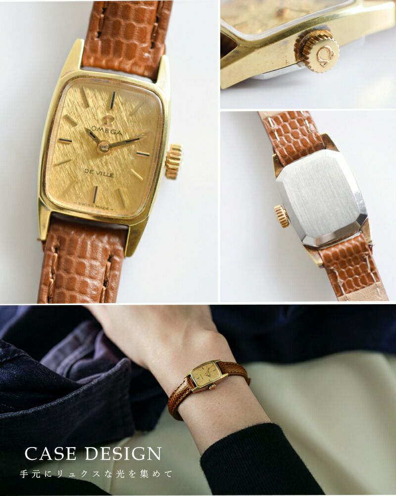 OMEGA(オメガ)より、ヴィンテージウォッチ”DE VILLE”のご紹介です。小ぶりなスクエアケースに細めのレザーストラップの組合せで女性らしい華奢さと愛らしさを持ち合わせたウォッチ。ゴールドの文字盤とケースが艶めき、エレガントに輝きます。気品溢れるデザインはどんな装いにもマッチし、年齢を問わず永年愛用できる1本としておすすめです。