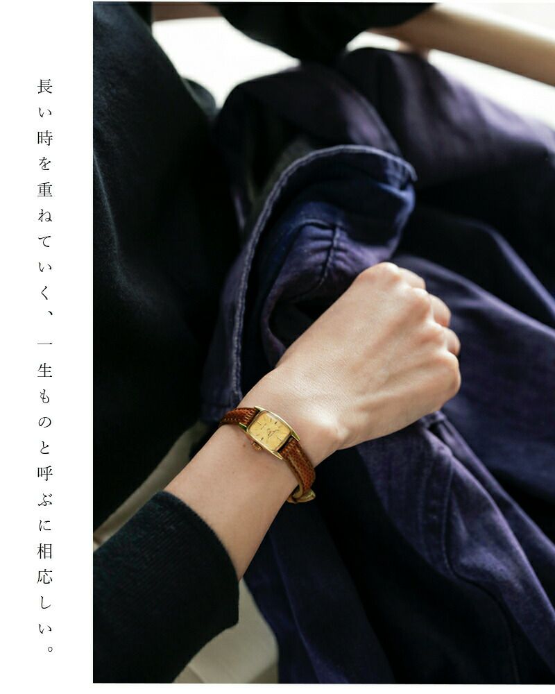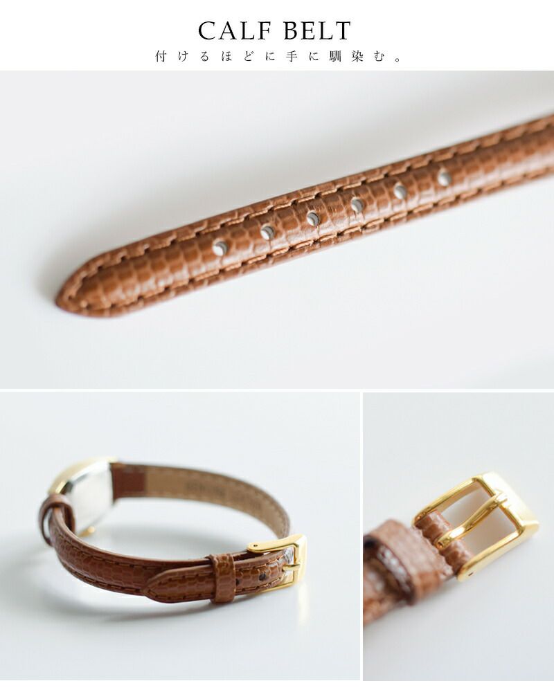 ベルトはしなやかなカーフレザーを使用しており、非常に上品な印象です。柔らかく耐久性も兼ね備え、身に着けるほどにしっくりと手首に馴染みます。6段階で調整可能です。留め具はケースと同じゴールドで統一感のあるデザインに。