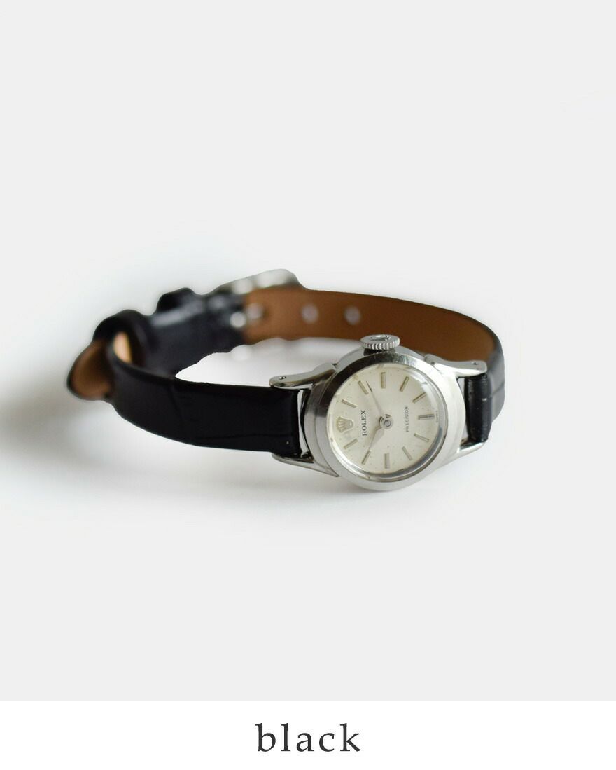 ROLEX(ロレックス)より、クロコ型押しカウレザーベルトヴィンテージウォッチ”precision”のご紹介です。1960年代製造のロレックスヴィンテージ。小ぶりなラウンドケースに、細めのレザーストラップの組合せで女性らしい華奢さと愛らしさを持ち合わせた腕時計。ゴールド見えするシルバーの文字盤とケースが艶めき、エレガントに輝きます。気品溢れるデザインはどんな装いにもマッチし、年齢を問わず永年愛用できる1本としておすすめです。