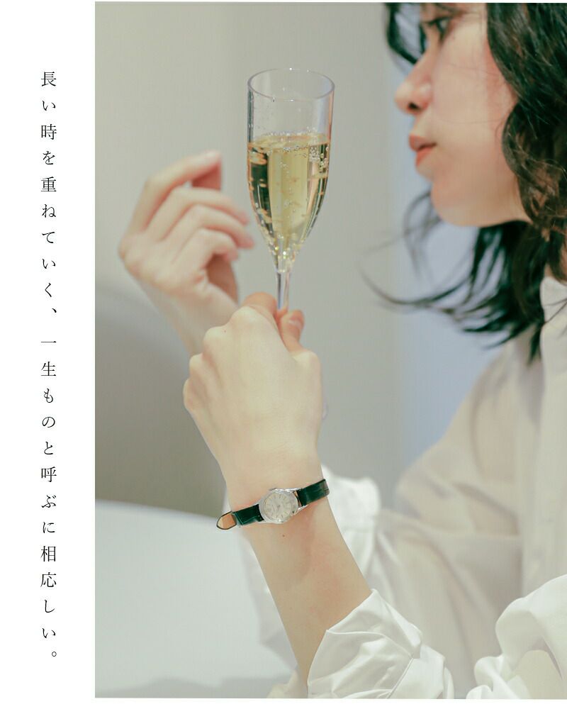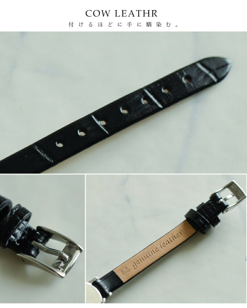 ベルトはしなやかなカウレザーを使用しており、上品な印象です。柔らかく耐久性も兼ね備え、身に着けるほどにしっくりと手首に馴染みます。クロコ型押しがあしらわれ、気品を感じさせます。7段階で長さ調整可能。留め具はケースと同じシルバーで統一感のあるデザインに。