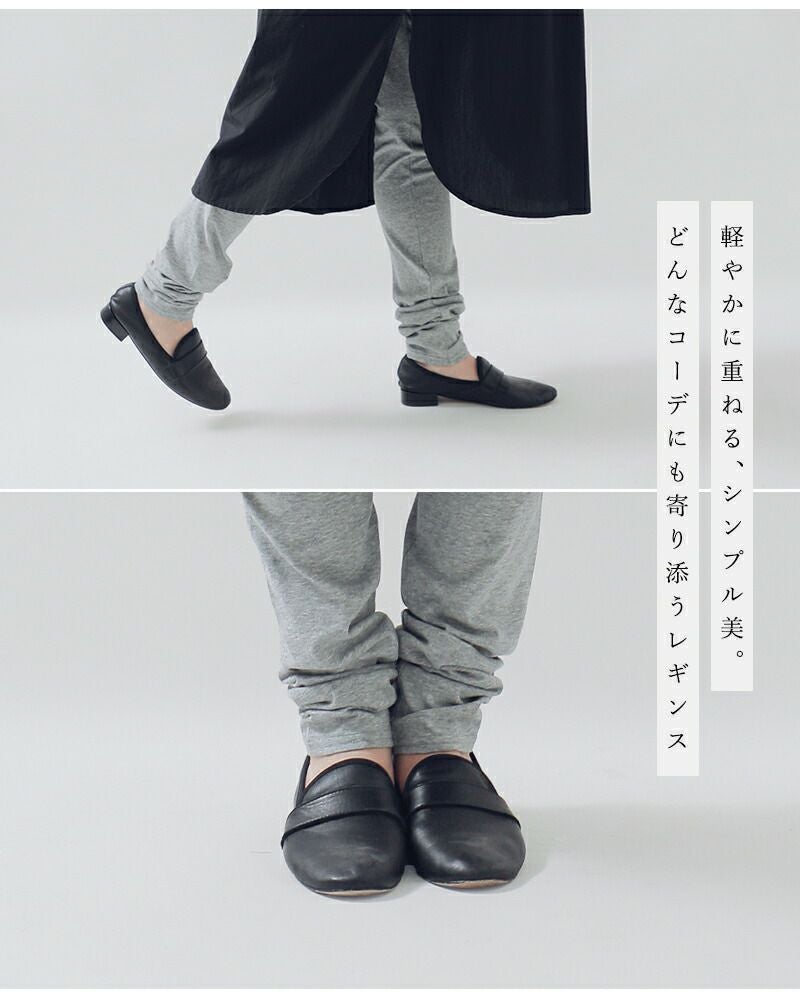 シンプルでナチュラルな雰囲気が漂うレギンス。薄手ながらも程よく脚にフィットし、締め付け感が少ない優しい履き心地が特徴です。長時間履いてもストレスフリーで、おうち時間からお出かけまで快適に過ごせます。裾をたるませて履けばラフで抜け感のあるスタイルに仕上がり、きれいめにもカジュアルにもマッチします。