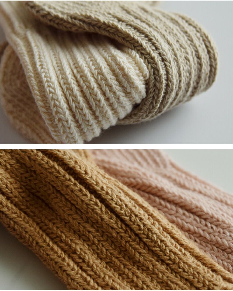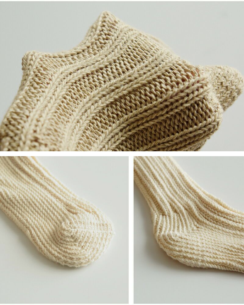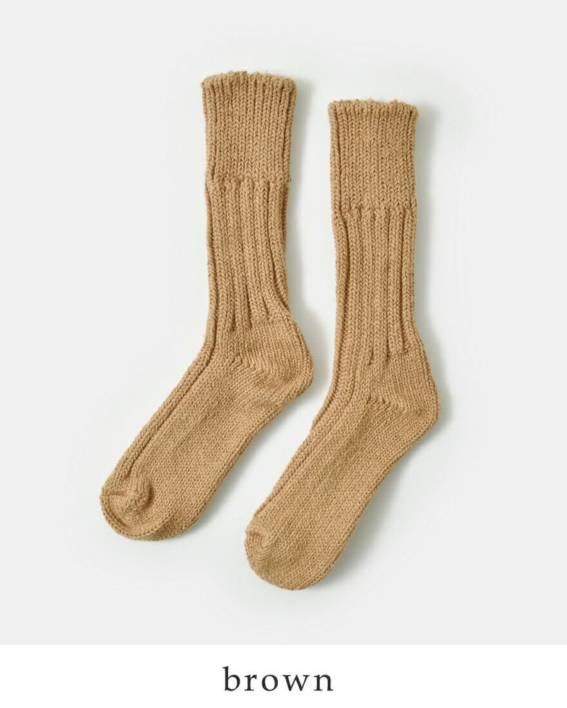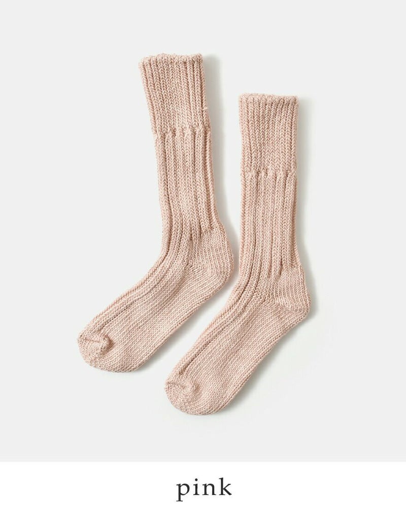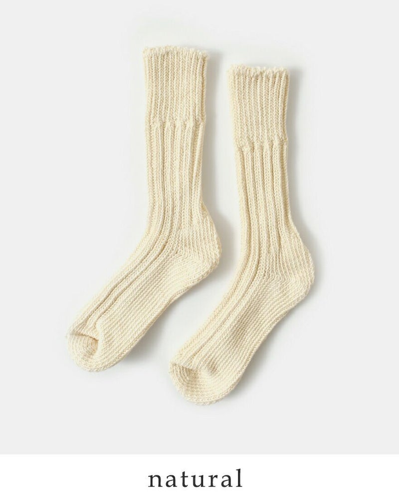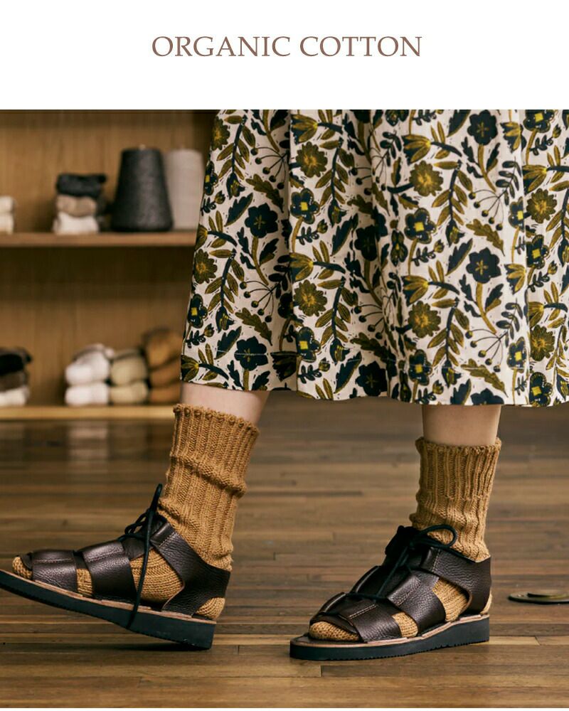 柔らかく心地よい素材のオーガニックコットンをたっぷりと使用し、足元に、ナチュラルな風合いと優しい履き心地を提供します。編み機として、英国 ベントレー社のヴィンテージマシンが使われており、ゆっくりとじっくりと編み上げられています。これにより “昔ながらの風合い” が出ています。