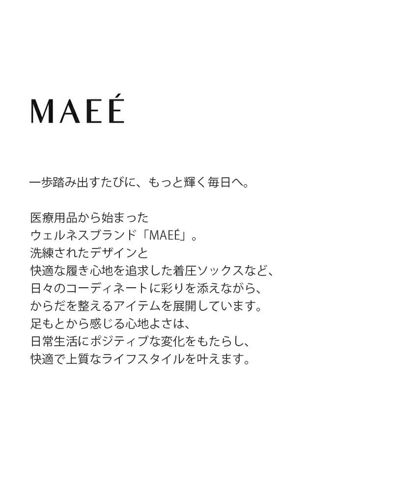 医療用品から始まった ウェルネスブランド「MAEE」。 洗練されたデザインと 快適な履き心地を追求した着圧ソックスなど、 日々のコーディネートに彩りを添えながら、 からだを整えるアイテムを展開しています。 足もとから感じる心地よさは、 日常生活にポジティブな変化をもたらし、 快適で上質なライフスタイルを叶えます。