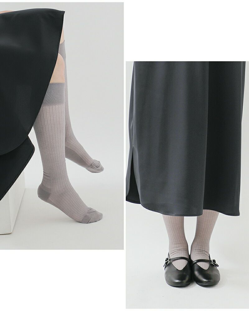 毎日身に着けるものこそ、ちょっといいものを、そんな大人の女性におすすめしたいコンプレッションソックス。寝ている時よりも立っている時の方が実はむくみやすく、MAEEは日中に着用するための着圧ソックスとして開発されました。着圧ソックスとは思えないほど自然な履き心地と、軽くて涼しいシアーの質感が魅力。いつもの靴下の代わりに履けば、知らず知らずのうちにむくみをケアしてくれます。