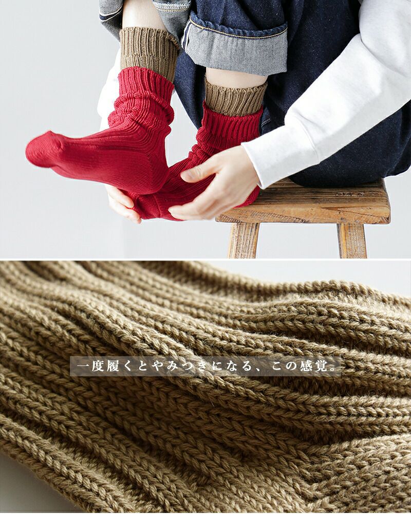 国内に現存する数少ないアンティークなリブ機で丁寧に編まれ、ふんわり滑らかな肌触り。丁寧に編まれているから丈夫で、洗うたびに風合いが増していきます。一度履くとやみつきになり、カラー展開も豊富なため、リピーターの多い定番人気の靴下です。