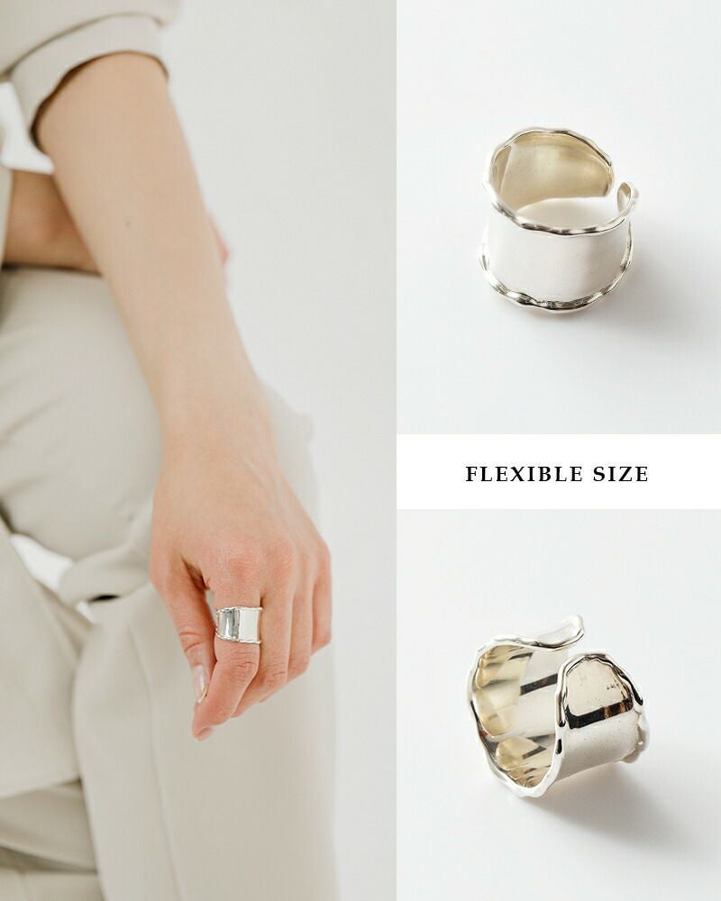 ともすればワイルドで男性らしさを感じさせるボリュームシルバーリングをディテールのこだわりでエレガントに。ヘムラインのたおやかな揺らぎデザインが全体に柔らかさを加えて大人女性にふさわしい質感に仕立ててくれます。