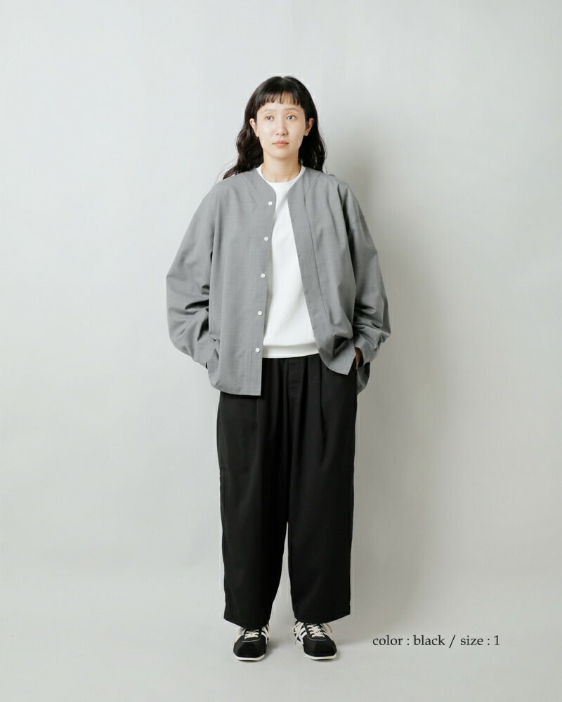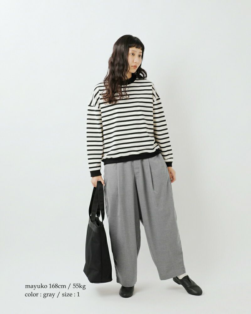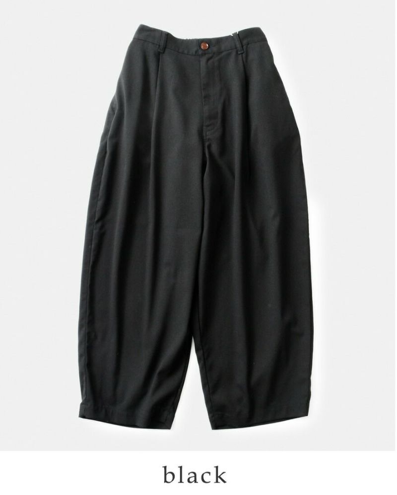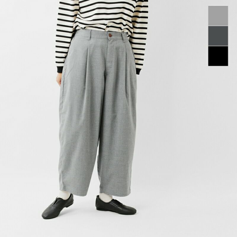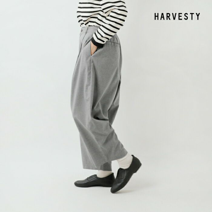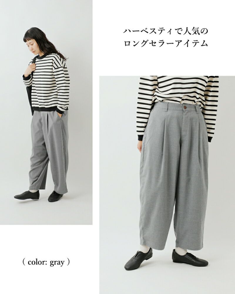 HARVESTY(ハーベスティ)の定番、ワイドエッグロングパンツのご紹介です。 ころんとした、たまごシルエットが人気のワイドパンツです。レーヨン混のさらりと軽くてドレープ感のある素材が、独特の丸みのあるきれいなラインのシルエットを出しています。きれいめにも合わせられるスラックスで、普段使いからおでかけまで、幅広いスタイリングを楽しめます。