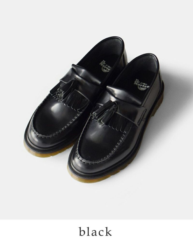 DrMartens(ドクターマーチン)よりレザータッセルローファー“ADRIAN”をご紹介します。大人気の定番タッセルローファーはドクターマーチンの最初の英国工場であるコブスレーン工場で1980年に初めて製造され、以来オフィスワーカーやスタイルに敏感な人々によって愛用され続けてきた逸品。レトロとモダンの要素を合わせ、縁飾り付きのタッセルアッパー、落ち着いたプレーンウェルト…絶妙なデザイン要素のバランスでいつの時代もトレンド感あるルックスを演出します。クラシックなシルエットを忠実に守っていますが、耐油性と対脂性に優れたソールを備え、実用性にも優れているのがおススメのポイントです◎