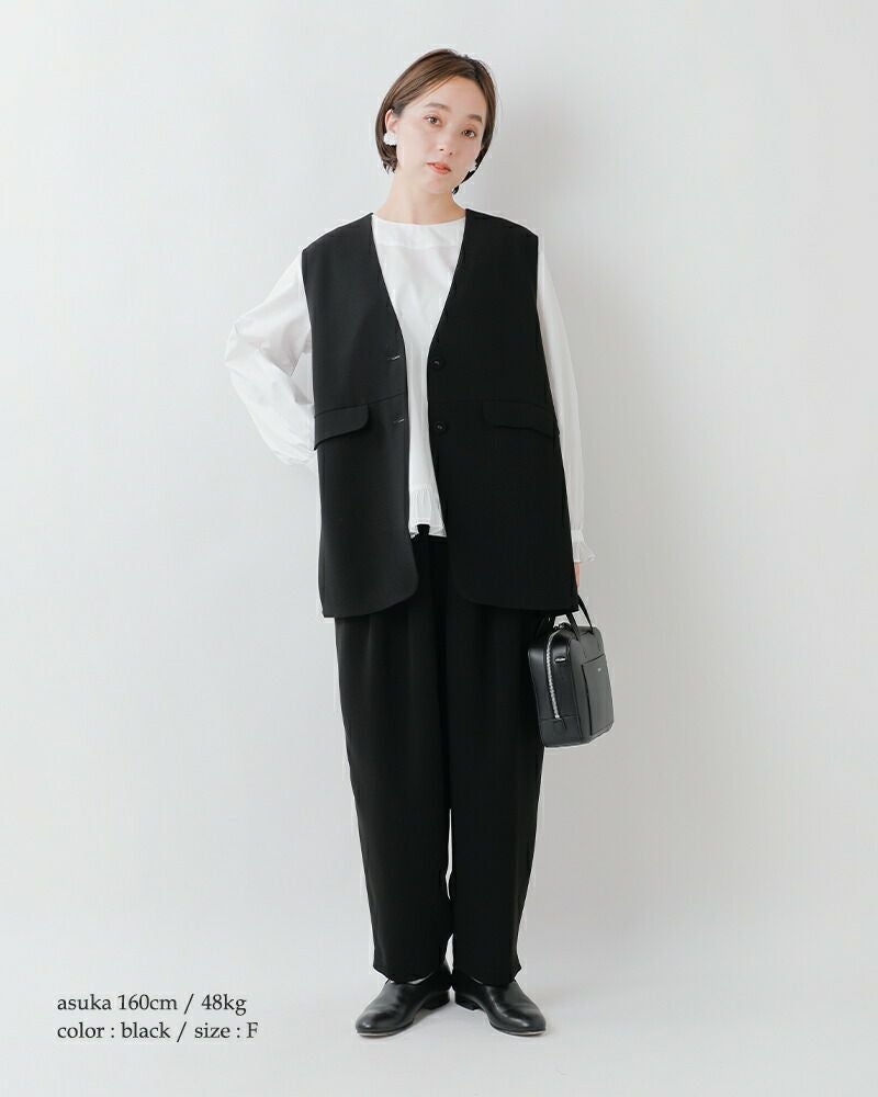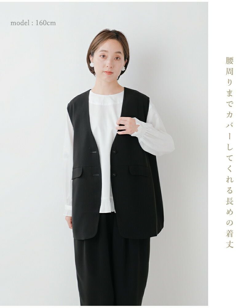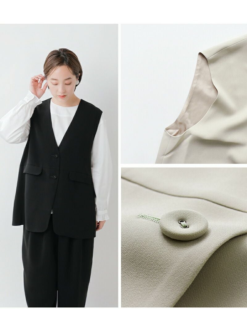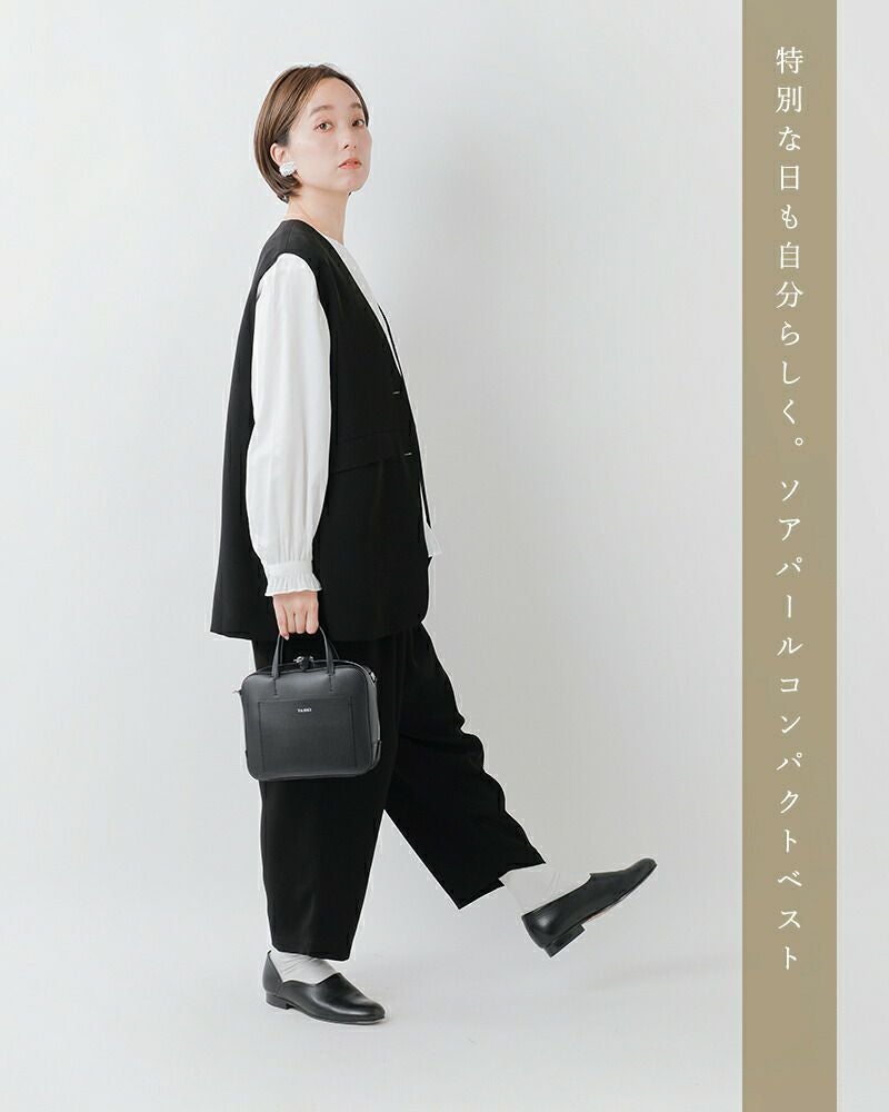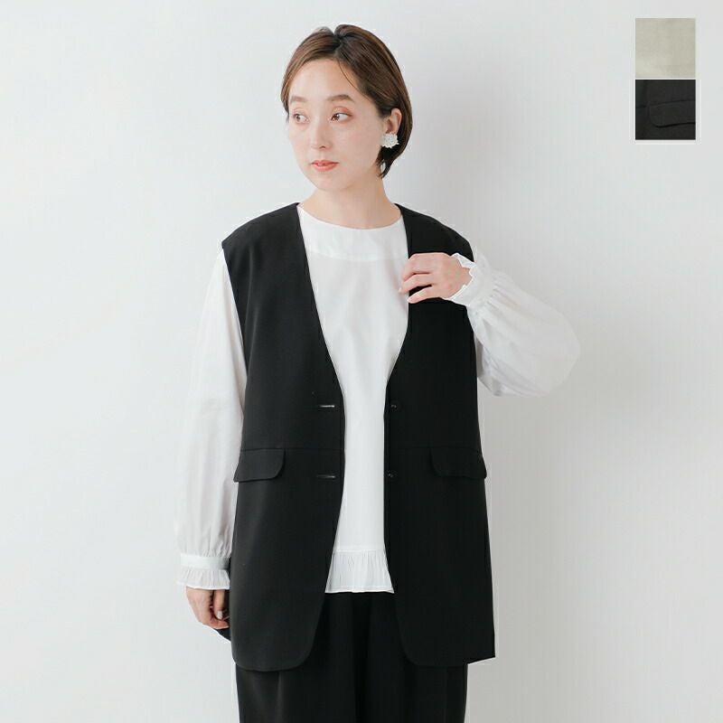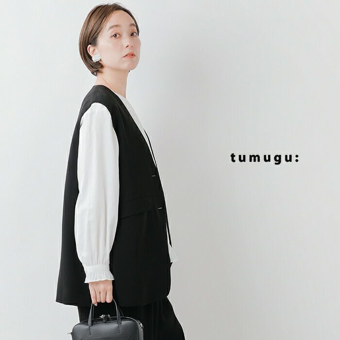 tumugu(ツムグ)よりソアパール コンパクト ベストのご紹介です。シンプルな中に上品さと可愛らしさを感じるベスト。腰周りをさりげなくカバーする長めの着丈や、シワになりにくい高機能素材を採用し、普段使いからビジネスシーン、さらにはオケージョンまで幅広く対応可能です。しなやかなドレープ感、マットな質感、ふくらみのある素材が生む気品は、ツムグらしいこだわりの一着。深めのVネックや共布ボタンなど、細部まで洗練されたディテールが、シンプルでありながら存在感を放ちます。どんなシーンでも活躍できるこの一着で、大人の洗練された装いをお楽しみください。