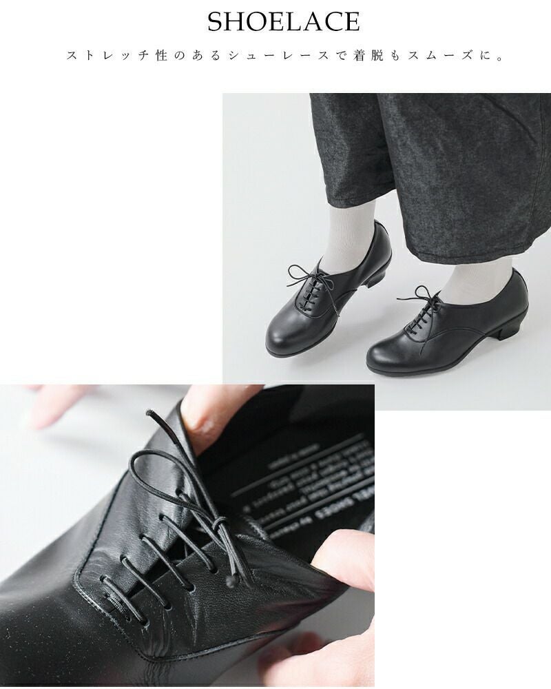 スマートな内羽根のレースアップシューズを女性らしいヒールでやわらかにアップデート。すっきりとシェイプしたトゥ形状でどんなパンツシルエットに合わせても綺麗にまとまります。