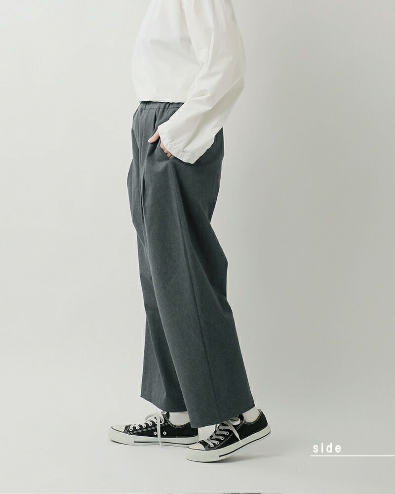 陰影が深くてシックな印象のタック。幅広のドローコードで結びやすいのも◎あえてヒップポケットをなくしてすっきりとしたデザインに仕立てられています。裾はシャープでエッジが効き、精緻で大人っぽい印象を与えてくれます。