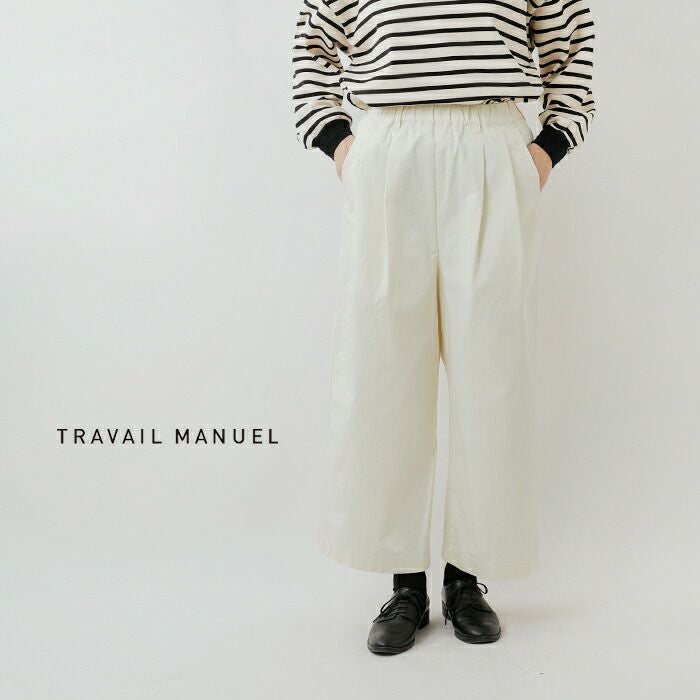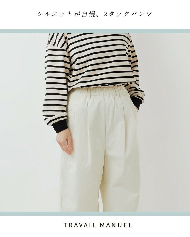 TRAVAIL MANUEL(トラバイユマニュエル)より、コットンコンパクトチノ2タックワイドパンツのご紹介です。しなやかでしっとり肌触りの良いコンパクトチノで仕立てたワイドパンツ。フロントにあしらったタックがウエストをすっきりみせ、すとんと落ちるボリュームを控えたワイドシルエットでヒップ周りや脚のラインを自然に目立たなくしてくれます。やや薄手でロングシーズンに穿けるので、涼しくなったらソックスとのスタイリングも楽しみたいですね。