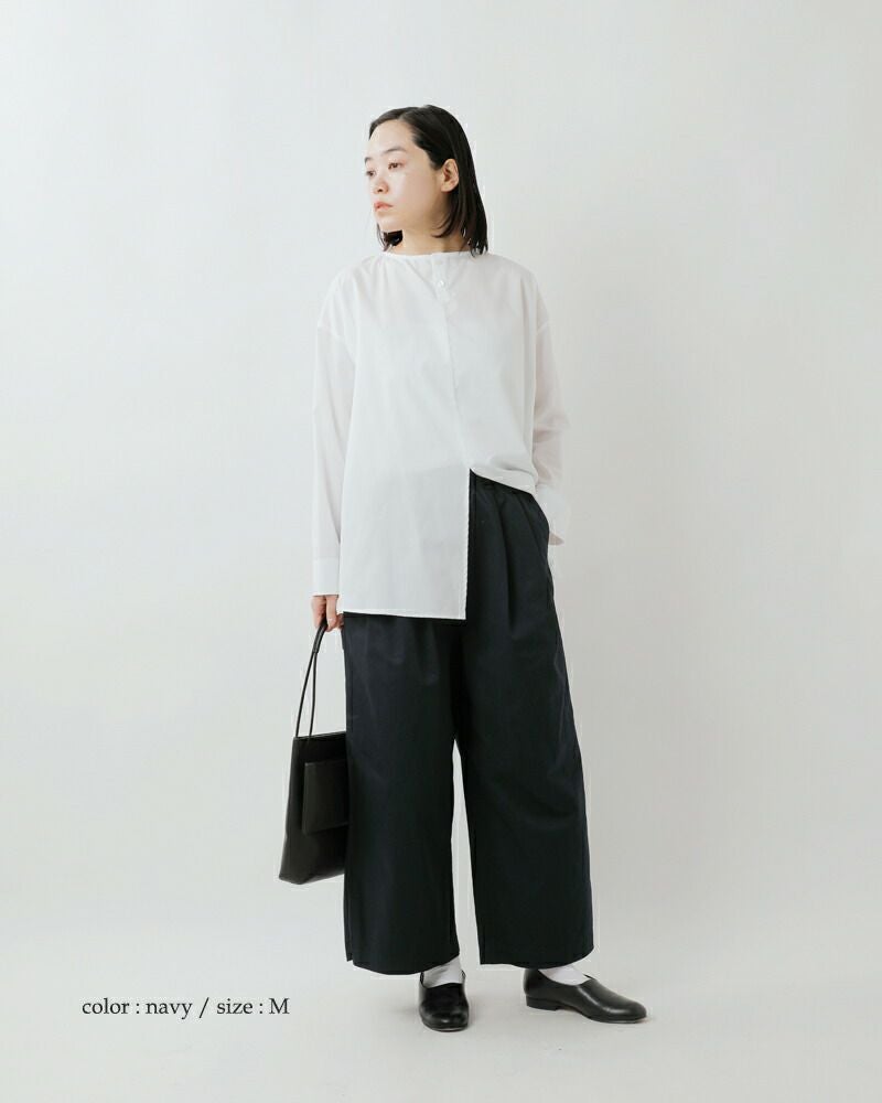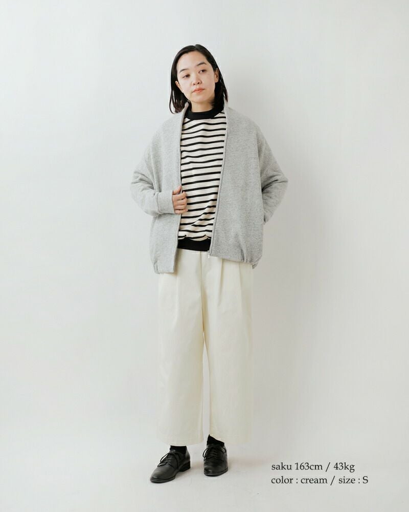 股上が深く、ウエストに深く2タックを入れることで、ゆったりとしたウエスト・ヒップまわりに。ストンと落ち感があり、裾の広がりも少ないデザインなのですっきりとした印象で穿いていただけます。