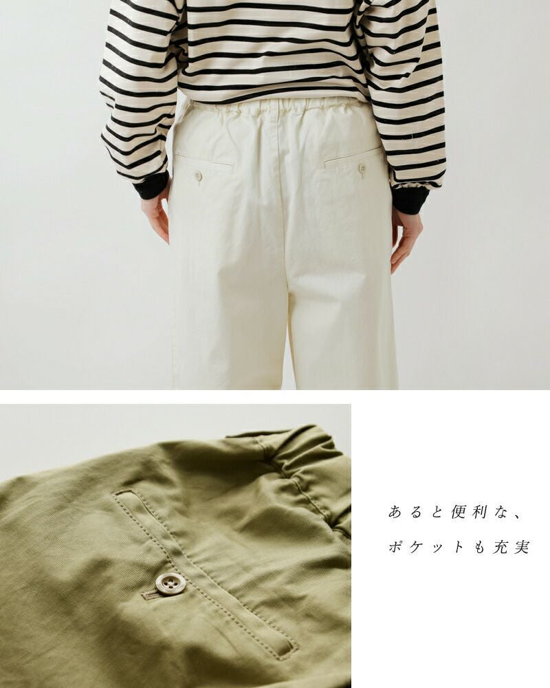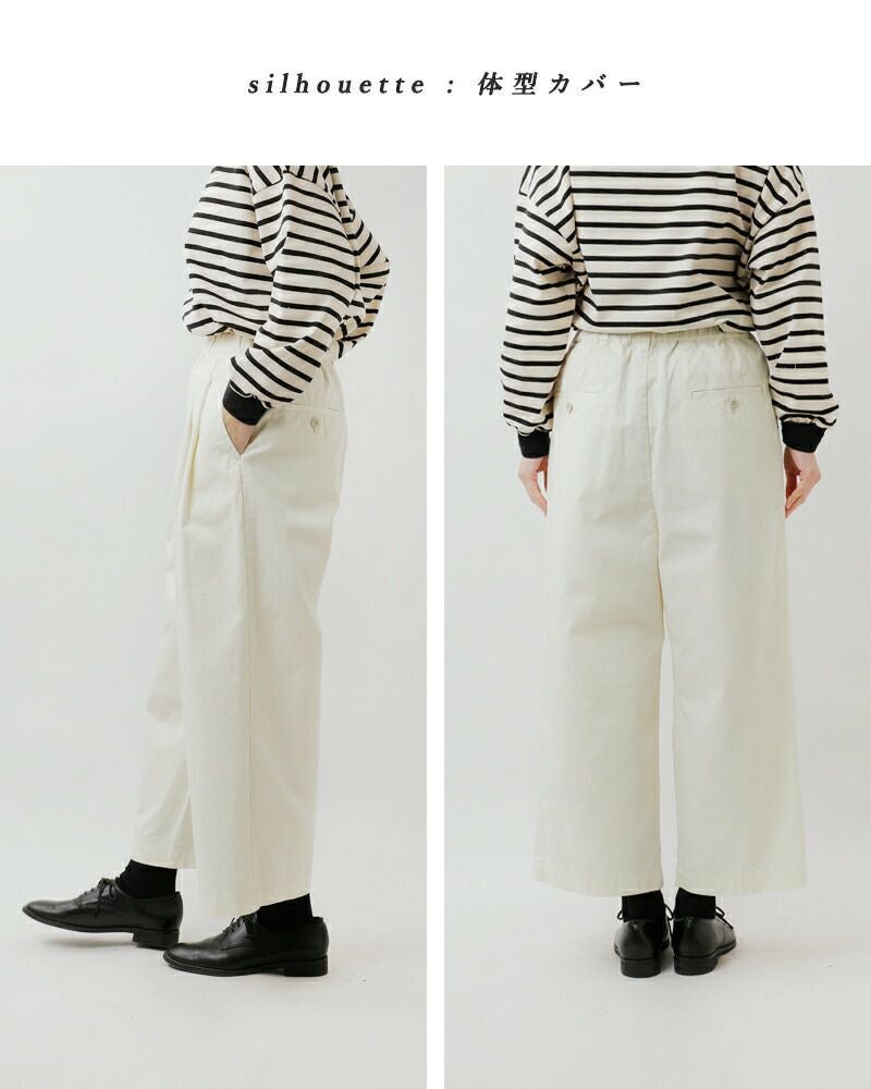 ウエストはゴム仕様でリラックス感のある着心地。ウエストの内側に平紐を通し、サイズ感を調節することが出来ます。フロントの美しい2タックがお腹・ヒップまわりをふんわりと包み込みます。ベルトループ付き。