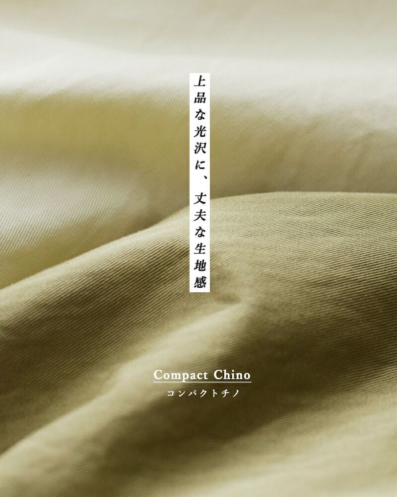 コンパクトチノは、糸の打ち込みを通常よりも多めにすることで素材自体に光沢感とハリ感を持たせた綾織りの丈夫な生地。洗い加工で仕上げられた程よい厚みのチノ素材は、最初から穿き込んだような柔らかさがあり、快適な穿き心地です。カジュアルながらも、品よくまとめる生地感が特徴です。