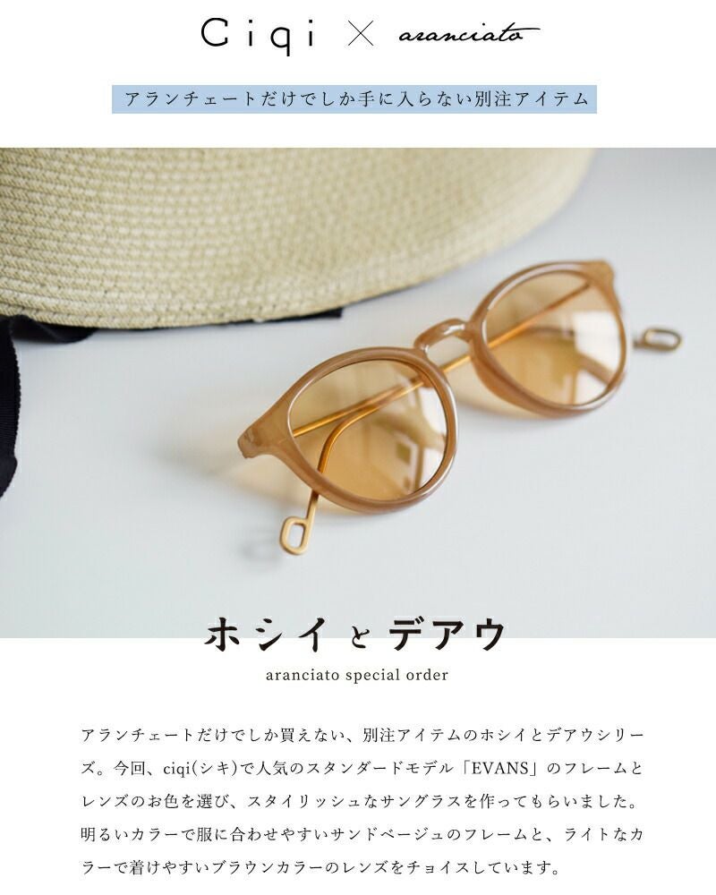 Ciqi(シキ)より、aranciato別注 UVカット ボスリントンサングラス“Evans”をご紹介します。アランチェートだけでしか買えない、別注アイテムのホシイとデアウシリーズ。今回、ciqi(シキ)で人気のスタンダードモデル「EVANS」のフレームとレンズのお色を選び、スタイリッシュなサングラスを作ってもらいました。明るいカラーで服に合わせやすいサンドベージュのフレームと、ライトなカラーで着けやすいブラウンカラーのレンズをチョイスしています。男女問わず掛けていただける、ボスリントンのフレームは、日本人の顔に似合うデザイン。紫外線を防いでくれるUVカットのレンズはイエローレンズなので、浮いた感じにならず、日常生活で気軽にお使いいただけます。ケース付きです。