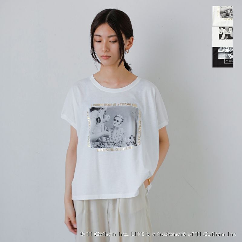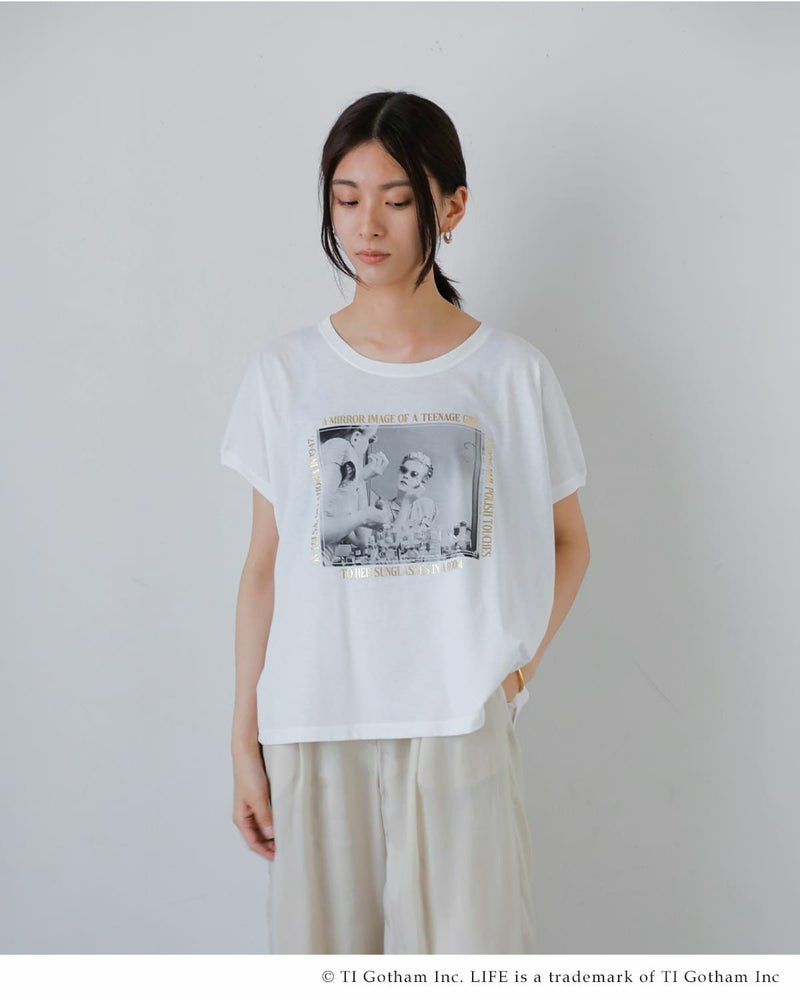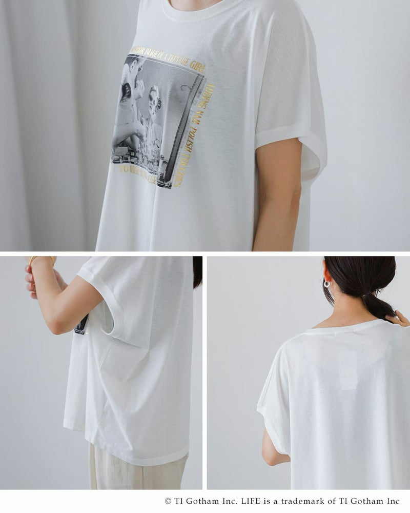 1936年から2007年までアメリカで発行されていたグラフ雑誌「LIFE」とのコラボレーションTシャツ。LIFEが保有する1,000万点以上のフォト・アーカイブから厳選された一枚をプリントに採用。フロントにあしらわれたヴィンテージ風の写真プリントが印象的で、アート性の高い仕上がりになっています。色展開はベーシックなホワイト系が2色とブラック系が1色。しわになりにくく柔らかい生地が魅力で肌ざわりがよく、素肌の上からでも快適に着用でき、程よくゆとりのあるシルエットでリラックスした着心地が楽しめます。ノースリーブで涼し気に着用でき日常に気軽に取り入れられる、存在感あるグラフィックTシャツです。