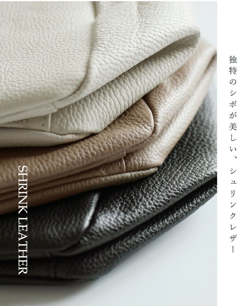 なめしの段階で特殊な加工を施し、革の表面を収縮させて独特のシボ表現したシュリンクレザーを使用しています。使い込むほどにくたっとしたヴィンテージ感のある質感に変化するのも魅力です。高級感がありつつ軽くて柔らかいので、デイリーに使いやすいレザーです。