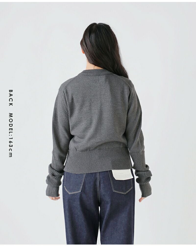 袖口には、親指を通すサムホールがついており、ロンググローブを手にはめているかのような袖リブが特徴的なデザイン。コートやジャケットの袖からのぞかせるのもおすすめです。