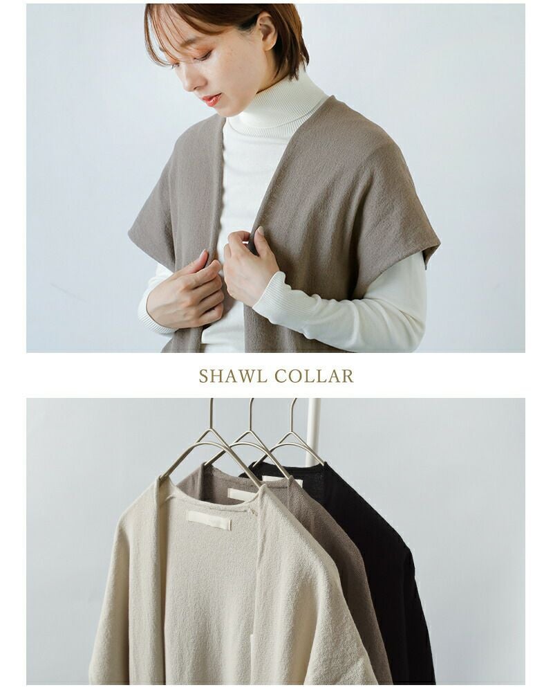 前立てにボタンや留め具がないショールカラー。柔らかな立ち上がりが、首元に優雅なニュアンスをプラスします。