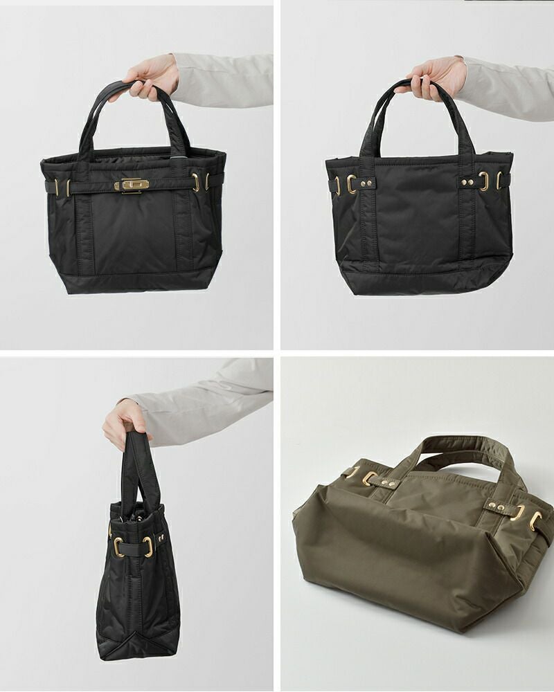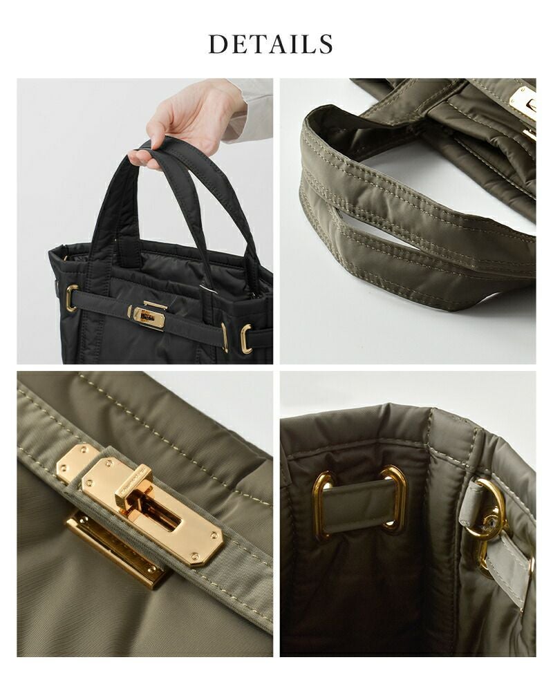 sita parantica(シータパランティカ)よりボンディング加工 トートバッグのご紹介です。中綿入りのふっくらとした風合いが目を惹くトートバッグ。表地の洋服などにも使用される高密度なポリエステル素材とゴールドのパーツ使いが高級感をプラスします。小さめのサイズ感ですが、しっかりとマチがある為、見た目以上の収納力です。 ちょっとした雨でも気兼ねなく使える素材感で、仕事からプライベートまで幅広くお使い頂ける 頼もしいバッグです。