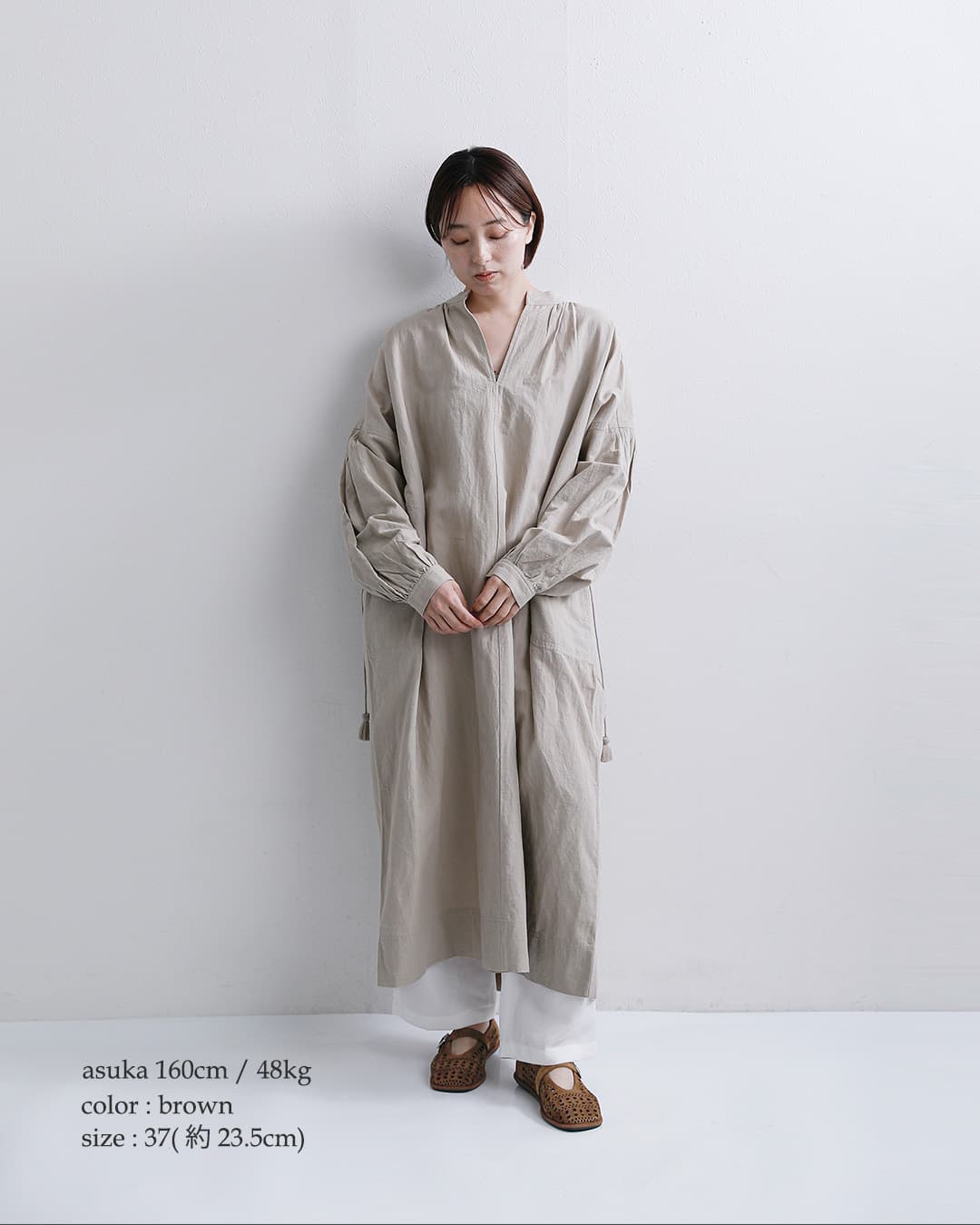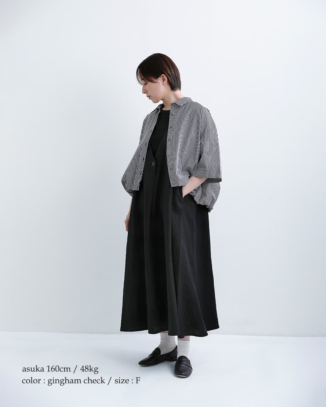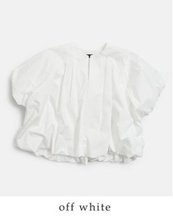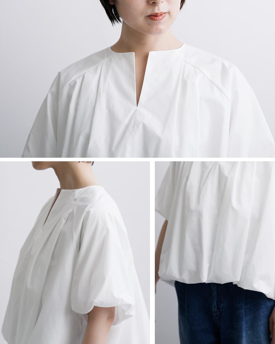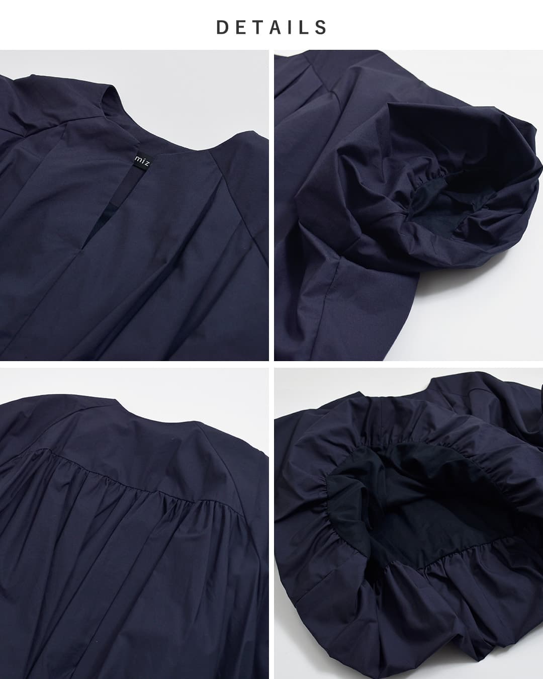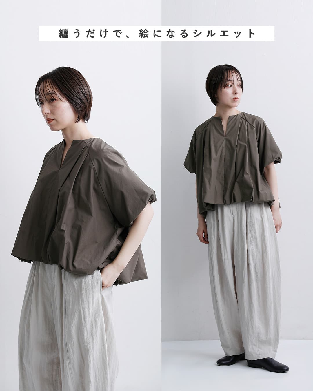 袖裾たっぷりボリュームふんわりシルエットバルーンノーカラーシャツ首元スリットデザイン背面タックリラックス裏地付き前後差ある着丈 mizuiro ind ミズイロインド コットン バルーン ノーカラー シャツ 1-230163 レディース 2026ss新作 春夏