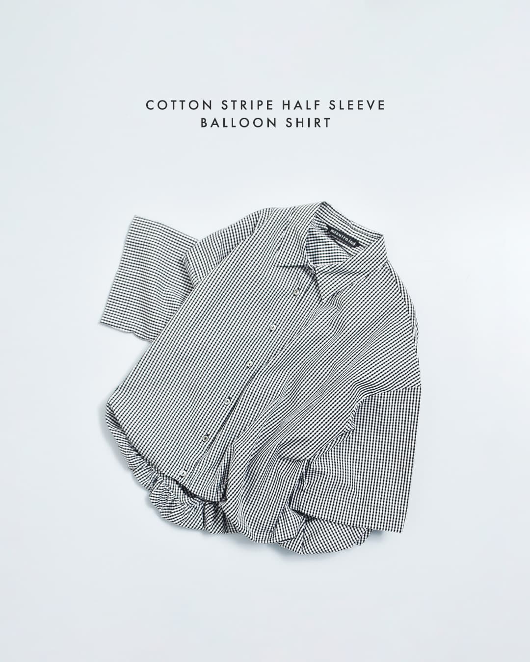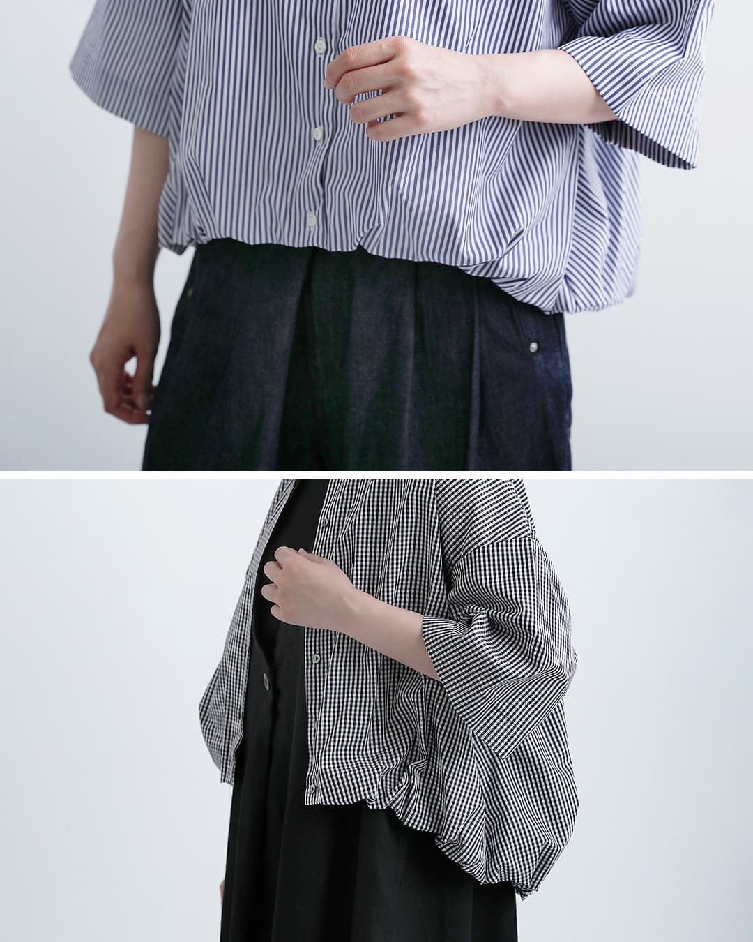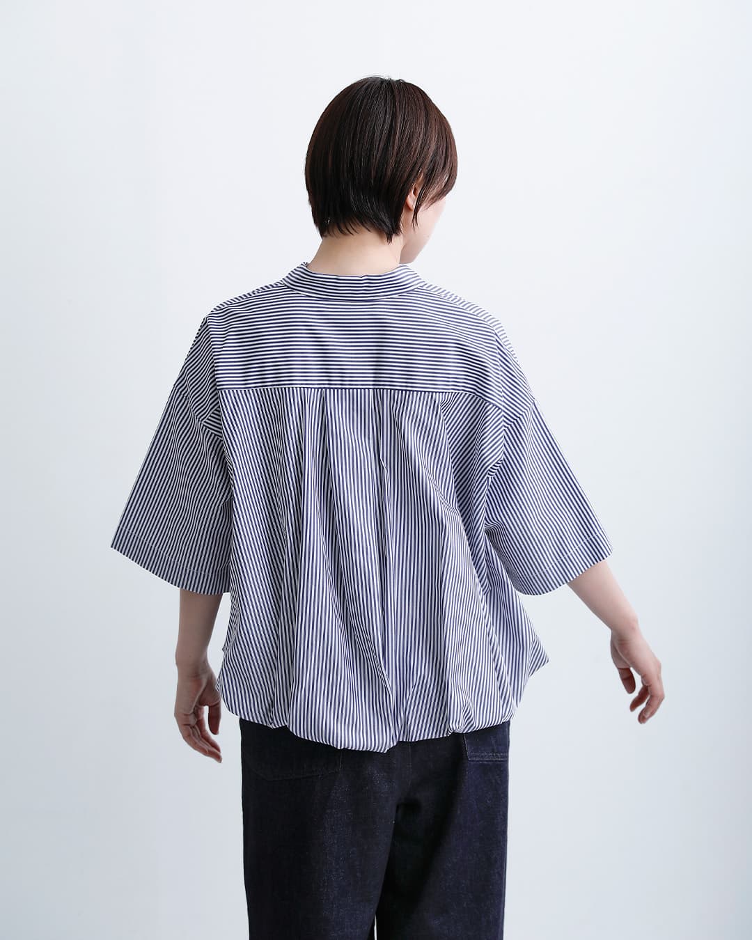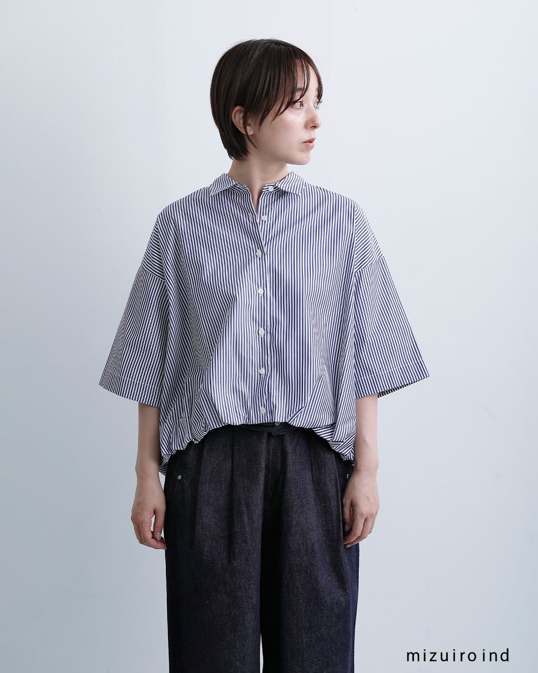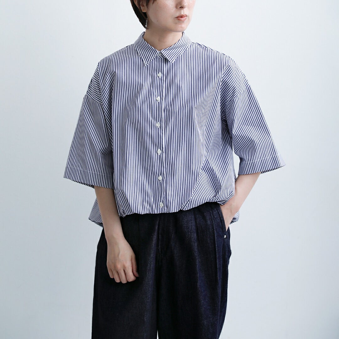 ふんわりとした裾バルーンのシルエットが魅力的風通しの良い5分袖のコットンストライプハーフスリーブバルーンシャツ mizuiro ind ミズイロインド コットン ストライプ ハーフスリーブ バルーン シャツ 2-230129 レディース 2026ss新作 春夏