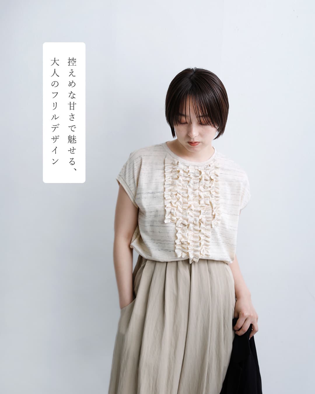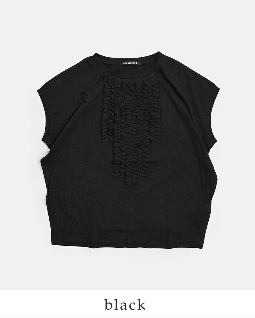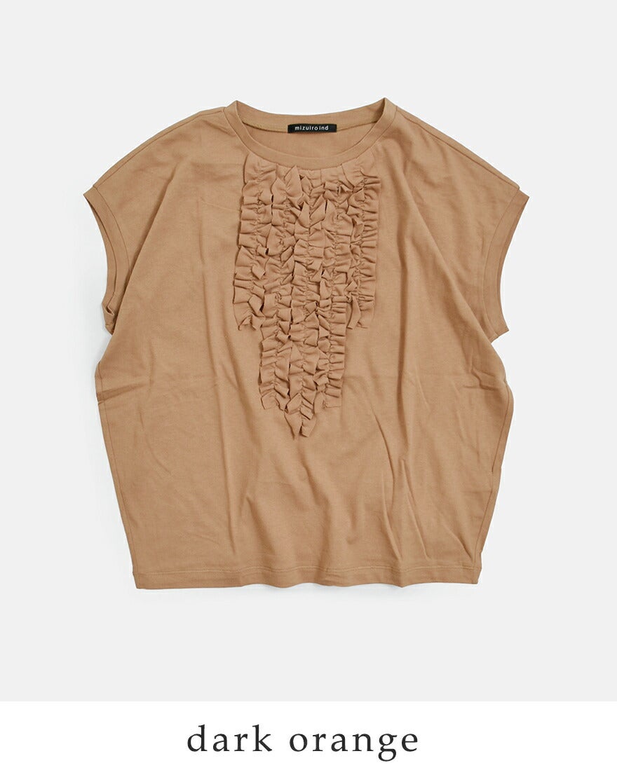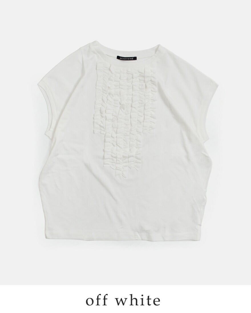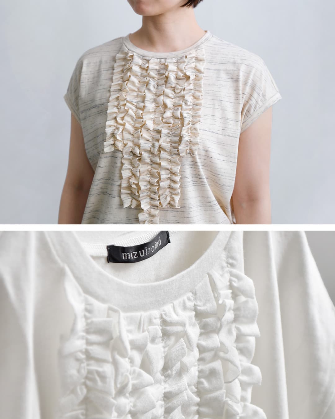 フロントフリルが上品なmizuiroindのフレンチスリーブトップス綿100%で涼しく着られる大人のきれいめカットソー mizuiro ind ミズイロインド コットン フレンチスリーブ フリル プルオーバー 1-210082 レディース 2026ss新作 春夏