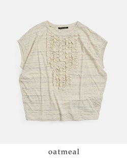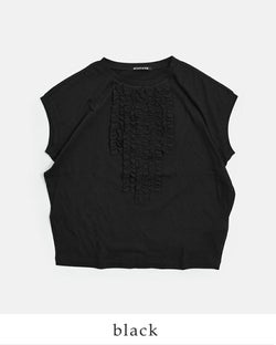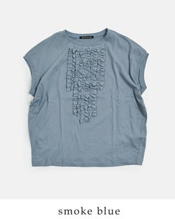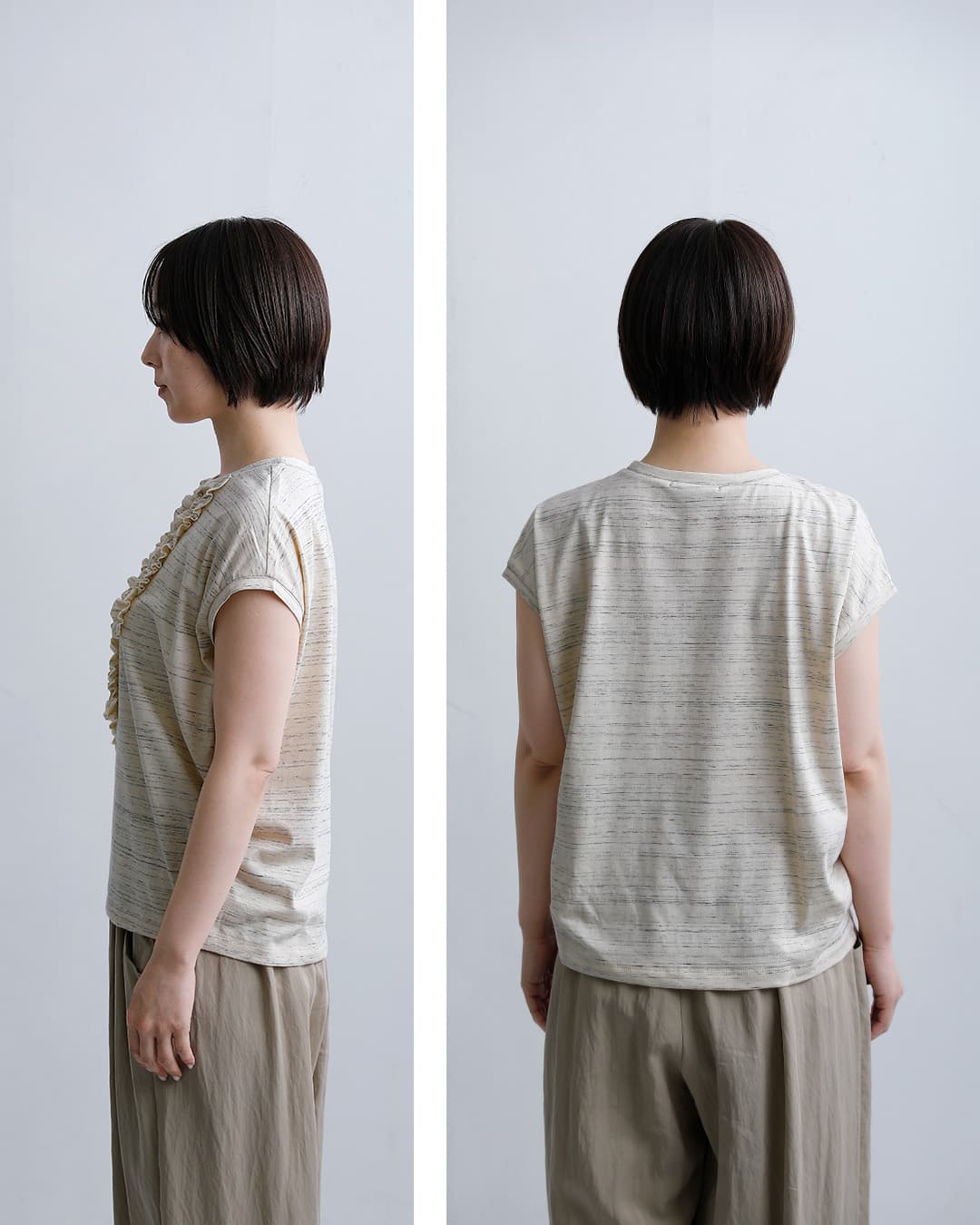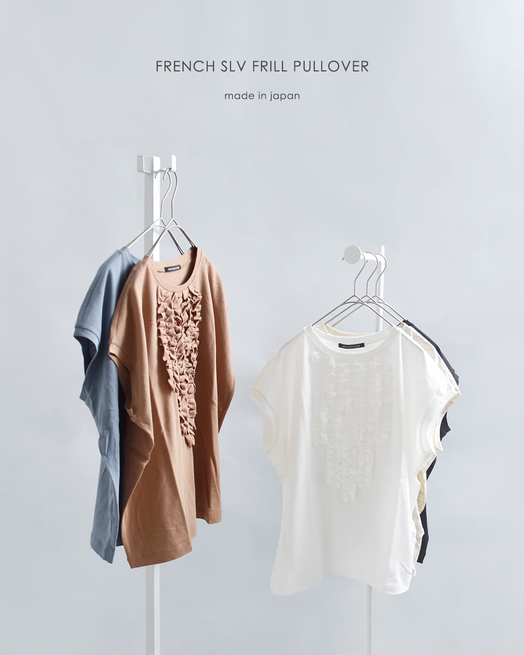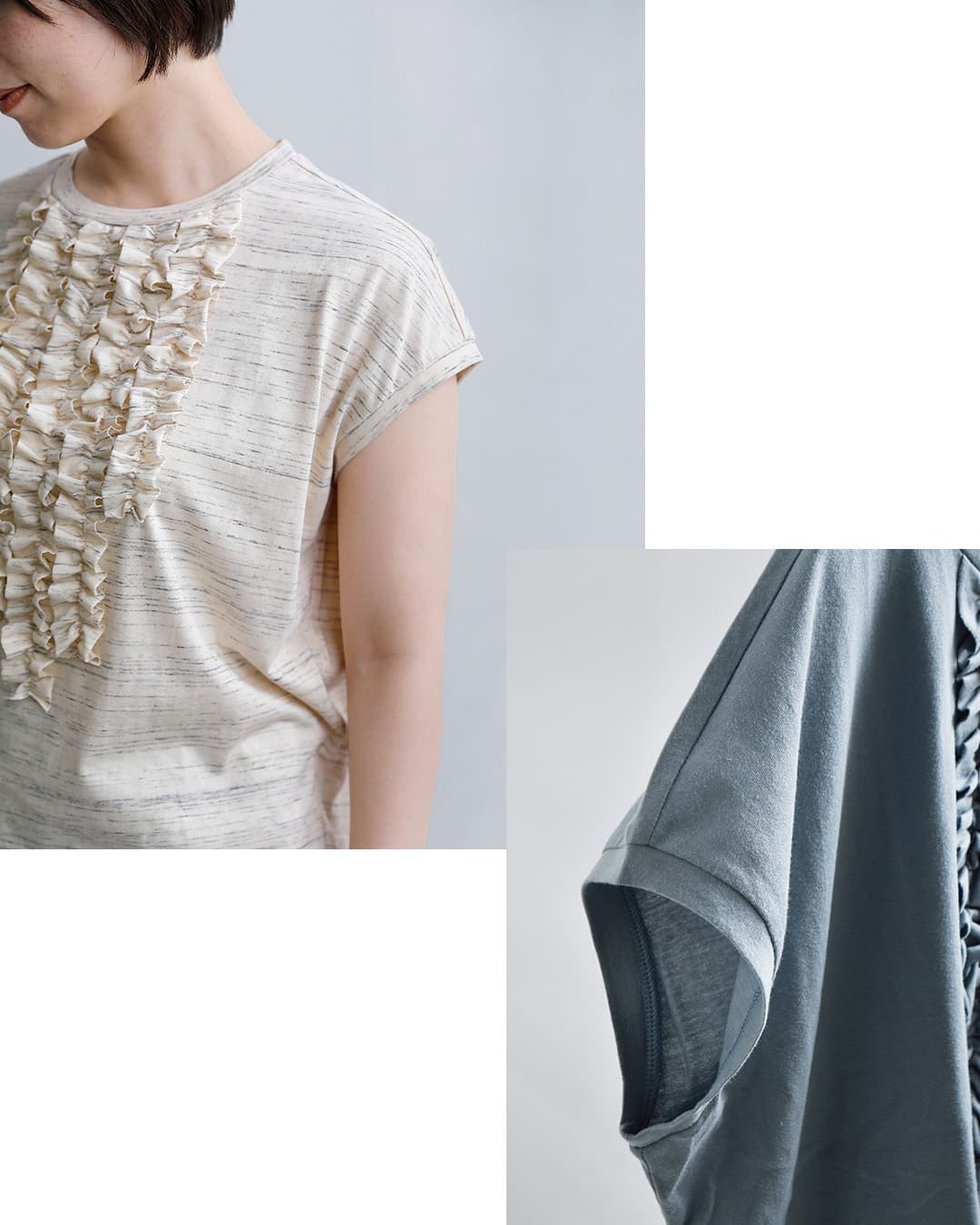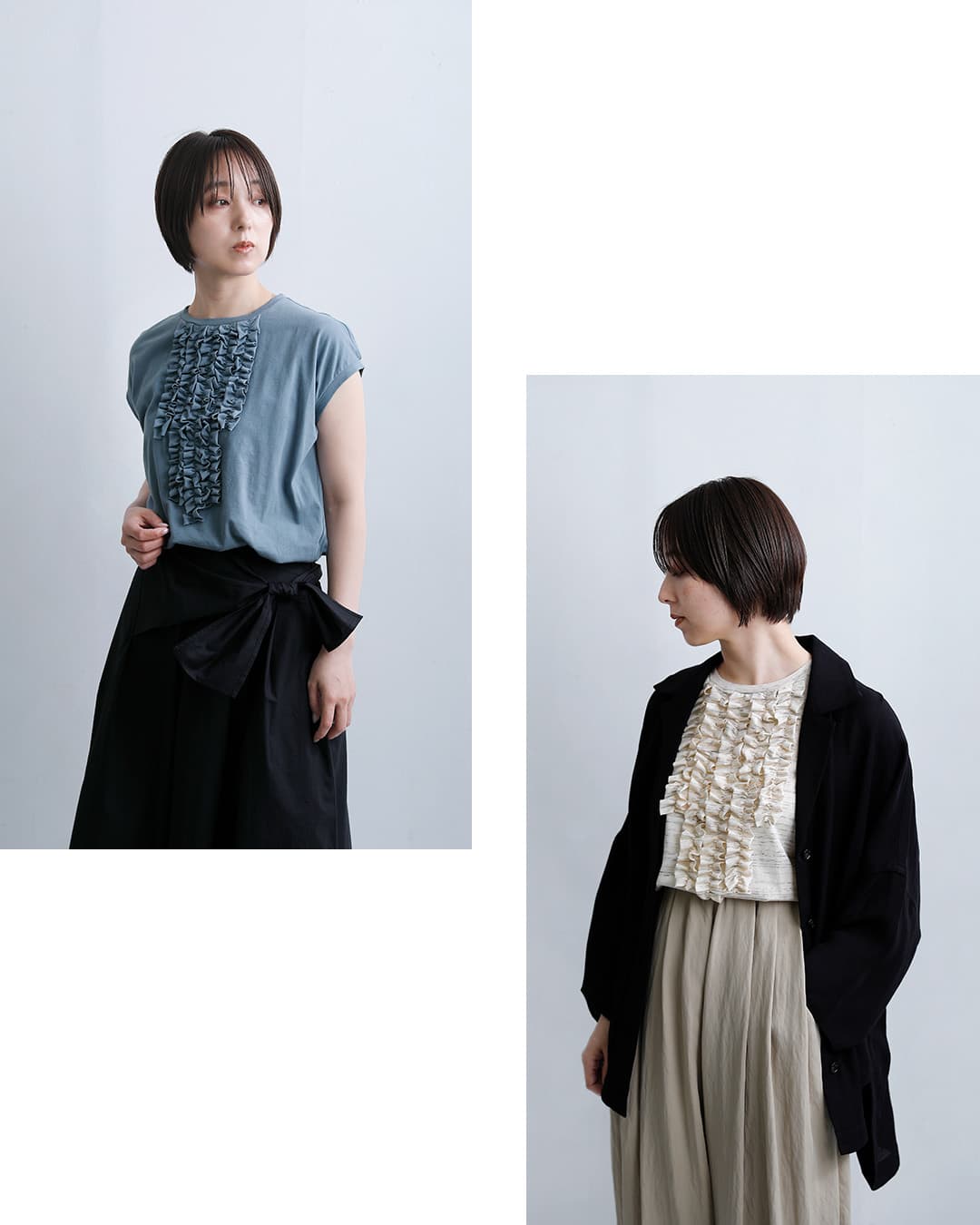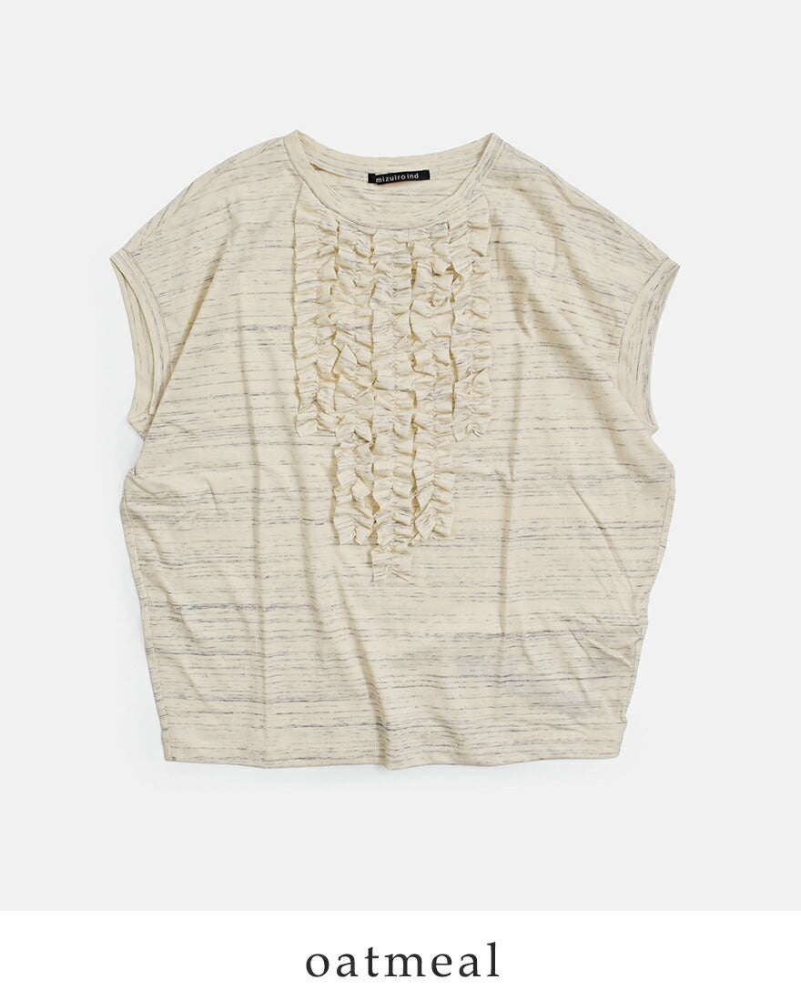 フロントフリルが上品なmizuiroindのフレンチスリーブトップス綿100%で涼しく着られる大人のきれいめカットソー mizuiro ind ミズイロインド コットン フレンチスリーブ フリル プルオーバー 1-210082 レディース 2026ss新作 春夏