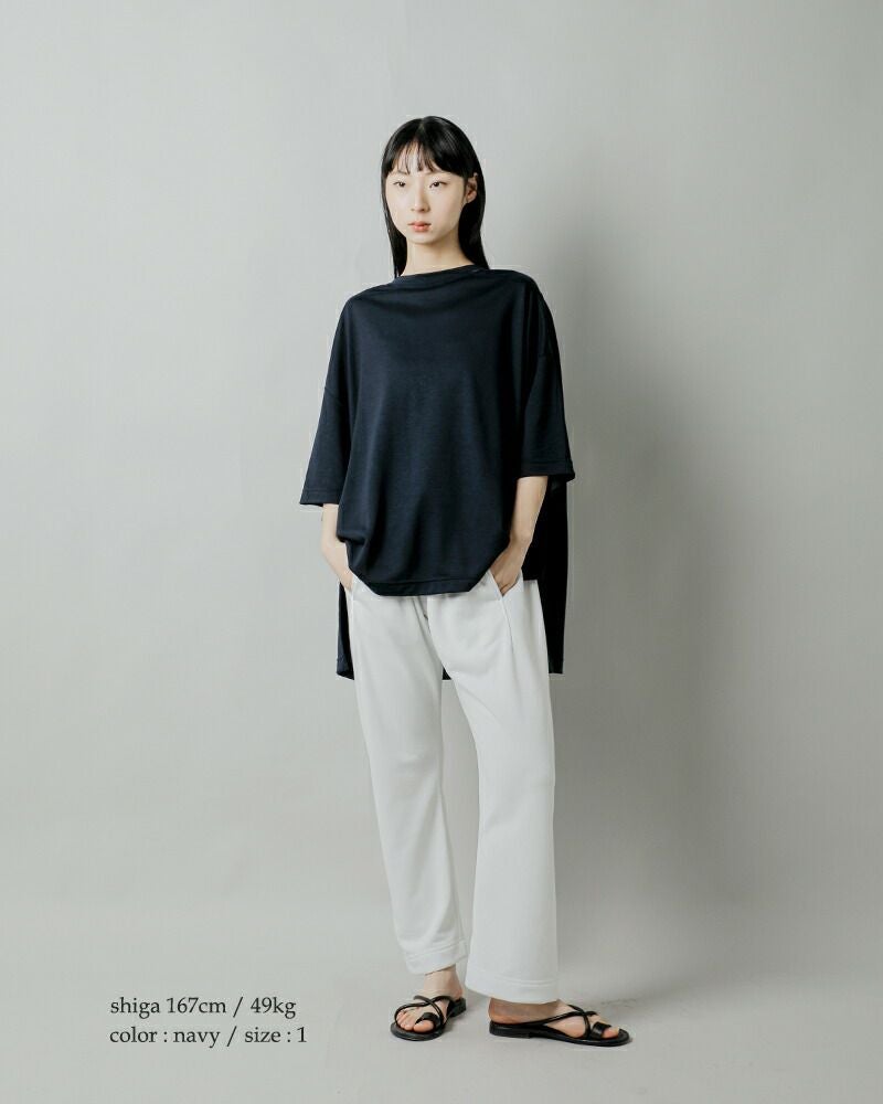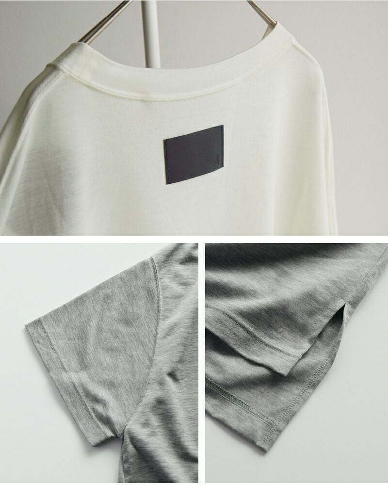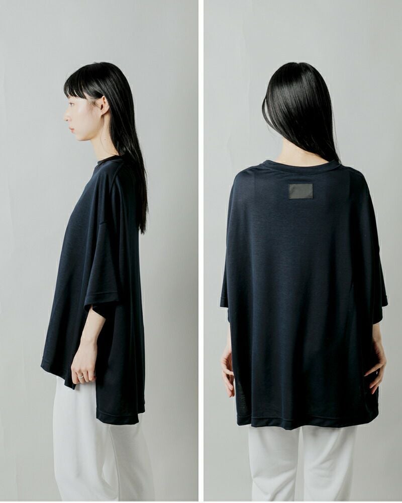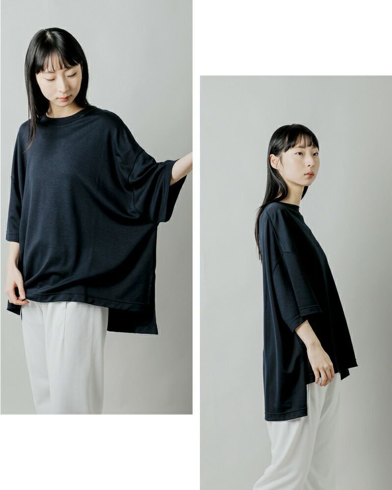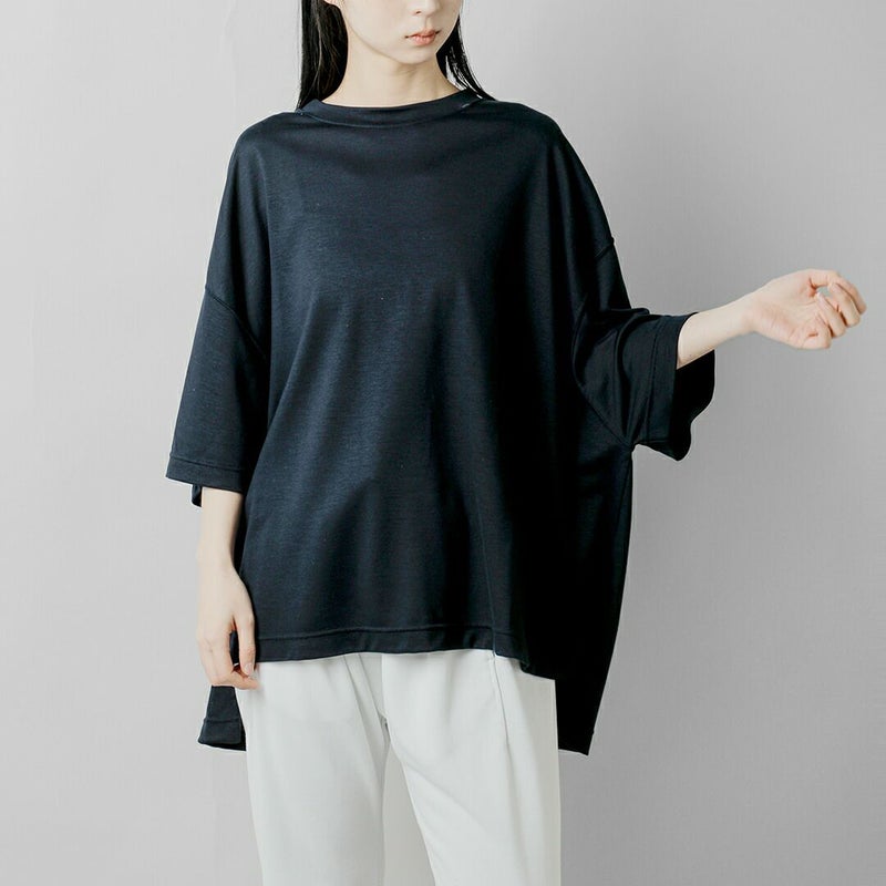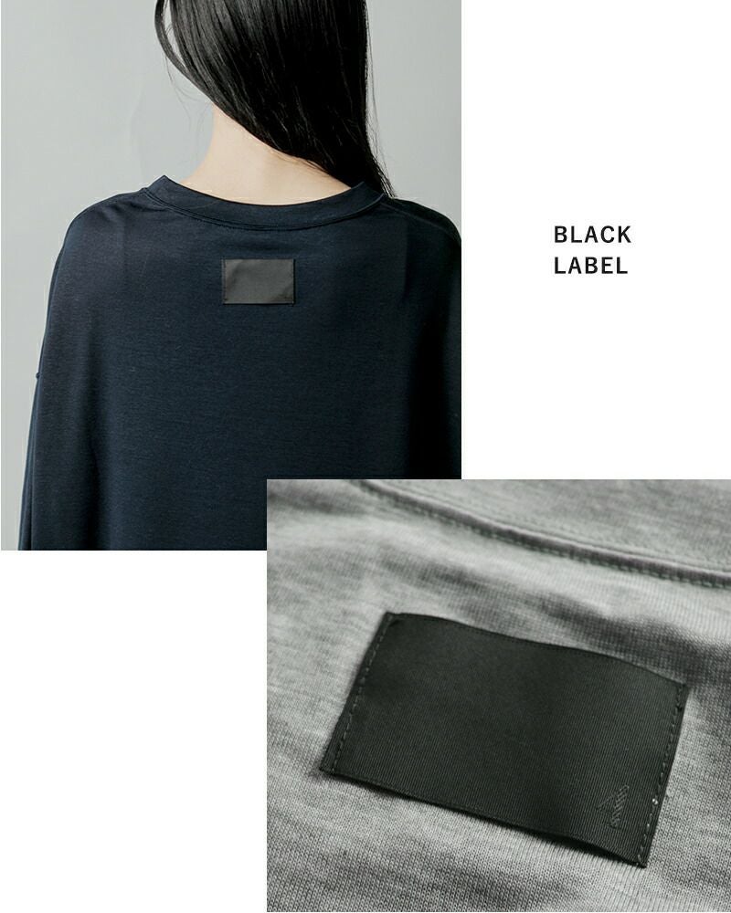 シンプルなデザインに、背中のブラックラベルがモダンなアクセントに。お袖は五分袖で、カジュアル過ぎないムードをつくります。