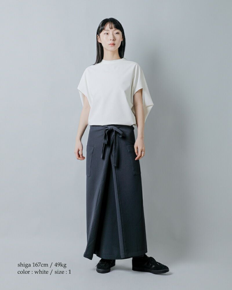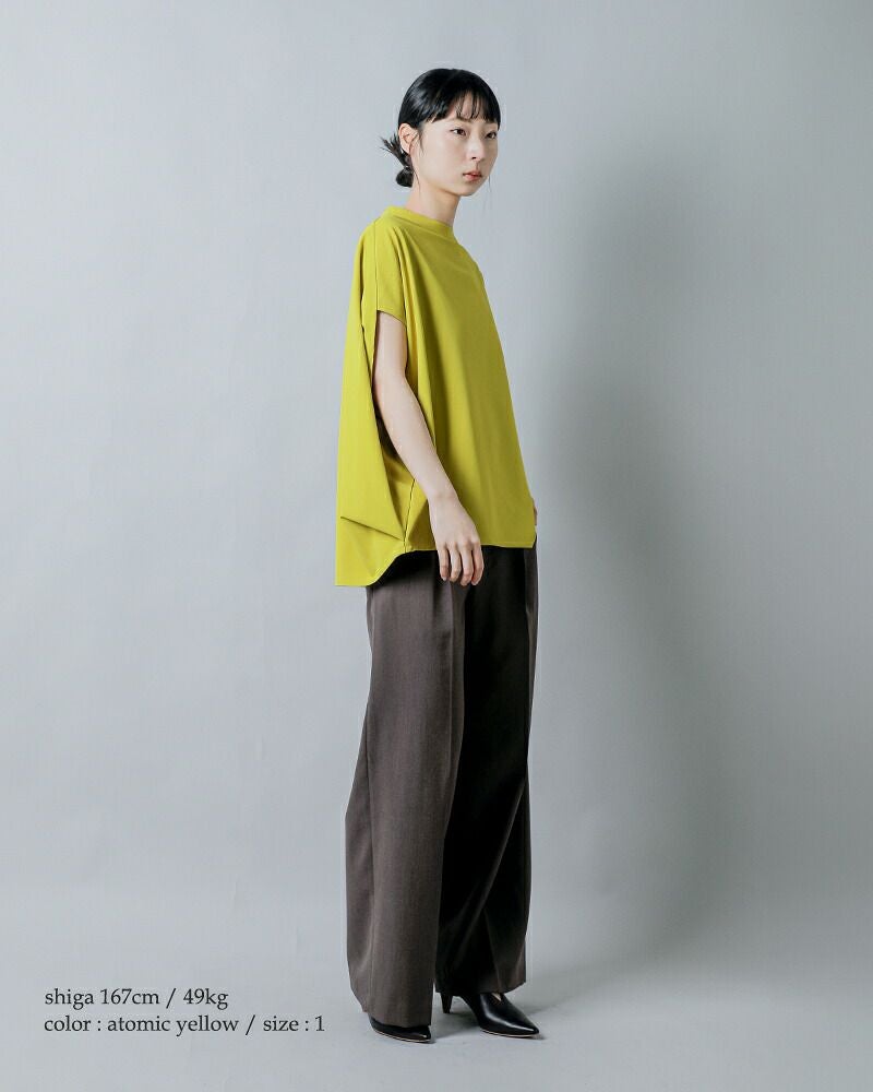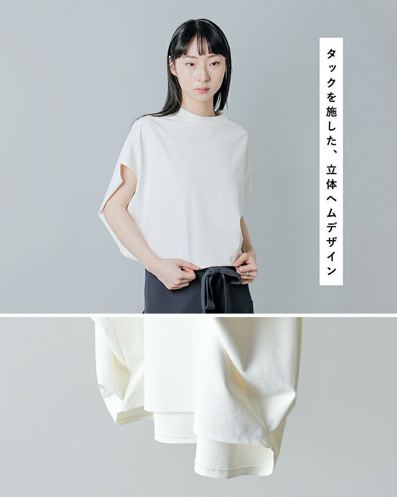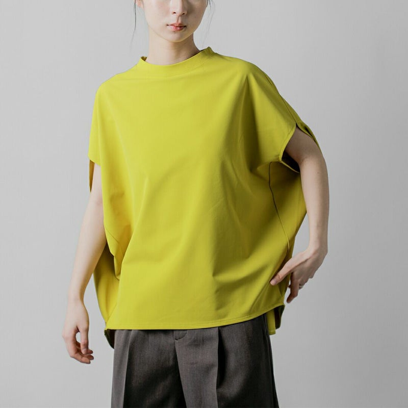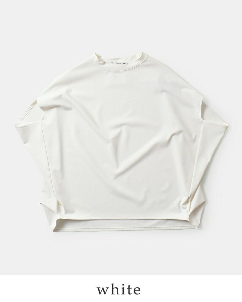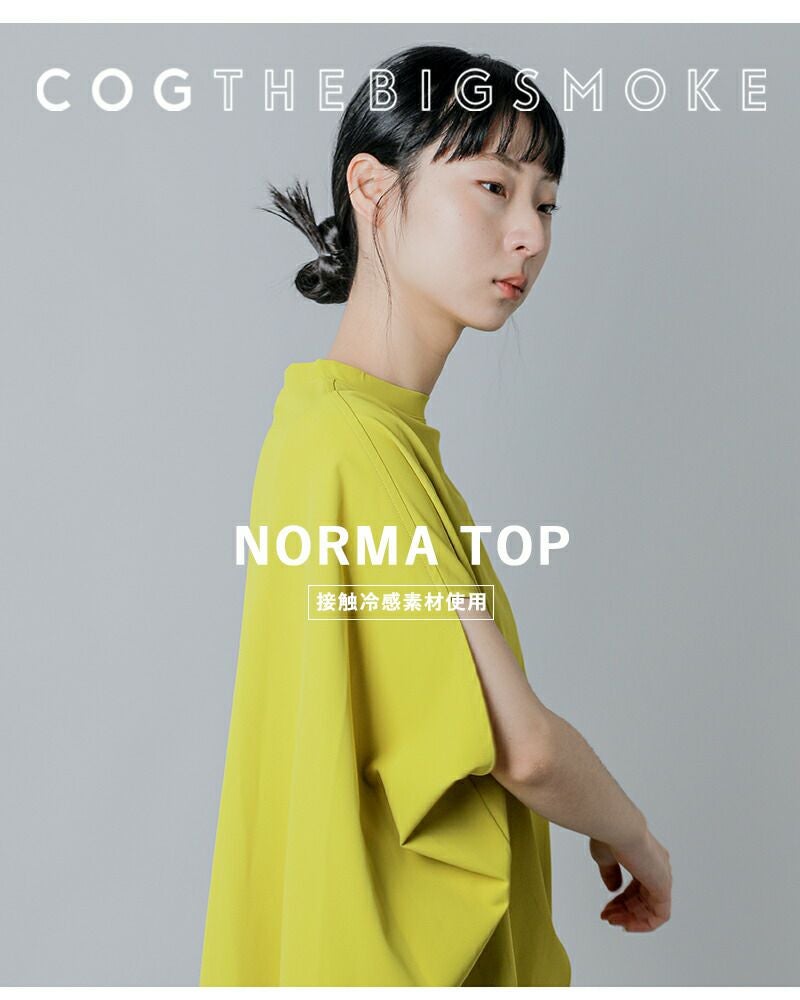 COGTHEBIGSMOKE(コグザビッグスモーク)より、接触冷感ツーウェイストレッチ フレンチスリーブ プルオーバー NORMA TOPのご紹介です。 コンパクトな前身頃に対し、肘あたりまで後ろから包み込むようにデザインされたボリュームのある後ろ身頃が印象的なトップス。 後ろ裾にはタックを入れ、ヒップをふんわりと覆うやや長めのラインに設計されています。 ネックはシンプルなクルーネック。シルエットの緩急と仕立てのコントラストが静かに際立つ一着です。