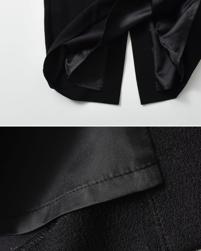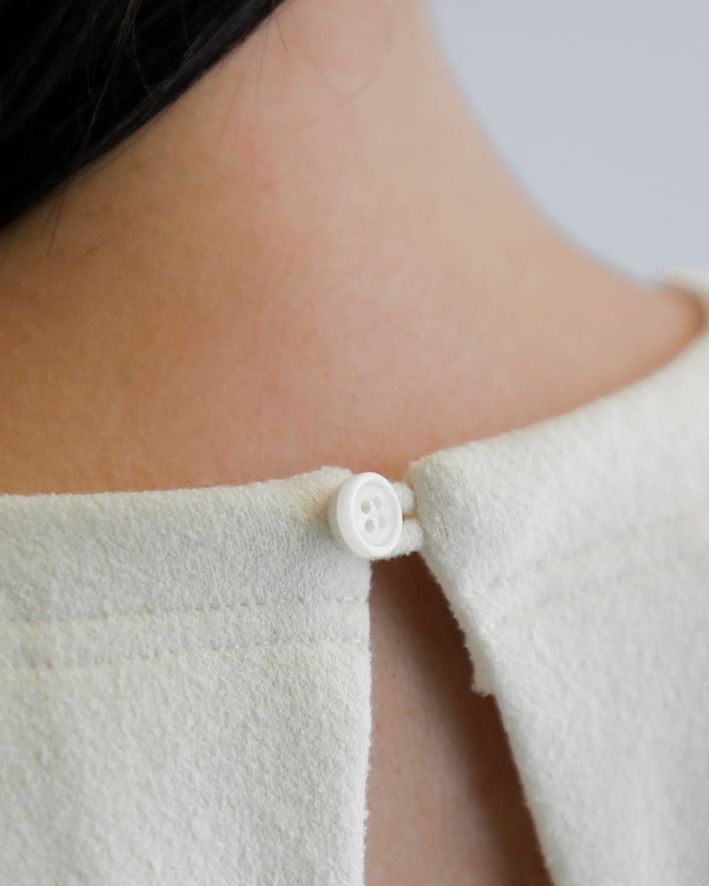 構築的でありながら、力の抜けた印象を併せ持つ雰囲気。ミニマルな佇まいの中に、さりげない女性らしさと上品さを感じさせる一着です。