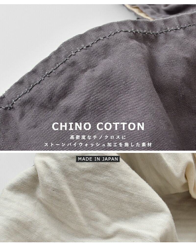 高密度なチノクロスにストーンバイオウォッシュ加工を施した定番素材。適度なユーズド感が魅力のファブリック。使い込むうちにさらに風合いが良くなり、お洗濯も出来る素材で、ガシガシお使いいただけます。内側にはコットンヘリンボーンの生地を張り、丈夫でタフな仕上がりに。