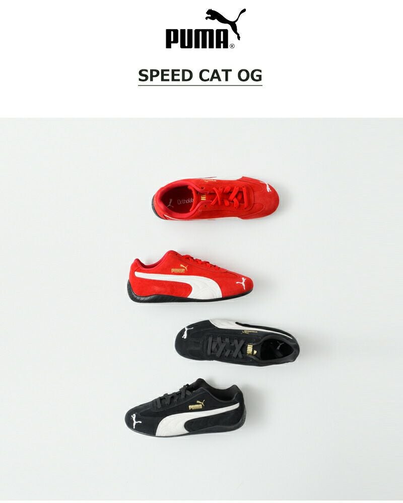 PUMA(プーマ)より、スピードキャットスニーカー SPEEDCAT OGのご紹介です。スピードキャットは、1999年に誕生し、80年代から90年代にかけてF1グランプリのドライバーが履いていた耐火レーシングシューズをベースにしたライフスタイルシューズです。レーシングにインスパイアされたなめらかなラインと空気力学に基づいたデザインにより、ファッションやスニーカーカルチャーに衝撃を与えてきました。