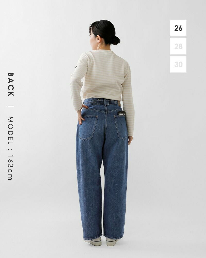 Levis 501の1900年代初頭のモデルを参考にした独自のワイドシルエット。腰回りはワイドで裾に向かって緩やかにテーパードしたシルエットなので、ワイドシルエットながらすっきりとした着こなしに。股上は深く設定されているので、窮屈感なく脚の動きを邪魔しません。