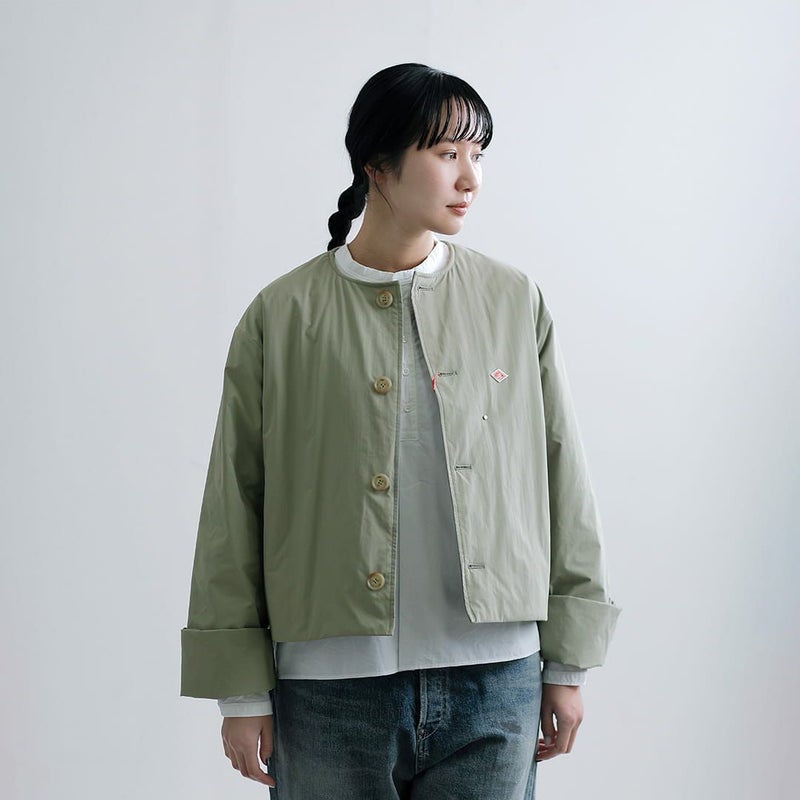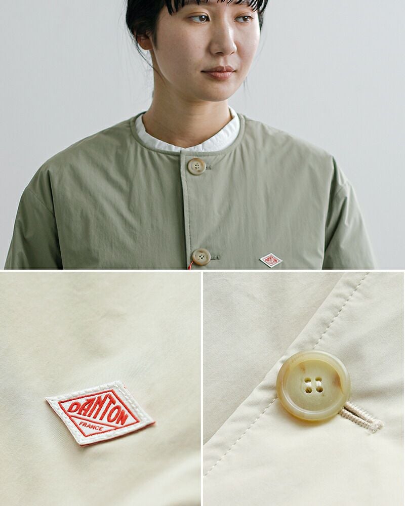 マットな表面感がシックな印象を与えるピーチタフタ素材ワイドな身幅が特徴のショート丈ノーカラージャケット DANTON ダントン インサレーション カラーレス ジャケット dt-a0672pnt-26ss 2026ss新作 春夏 レディース【海外出荷不可】 アウター